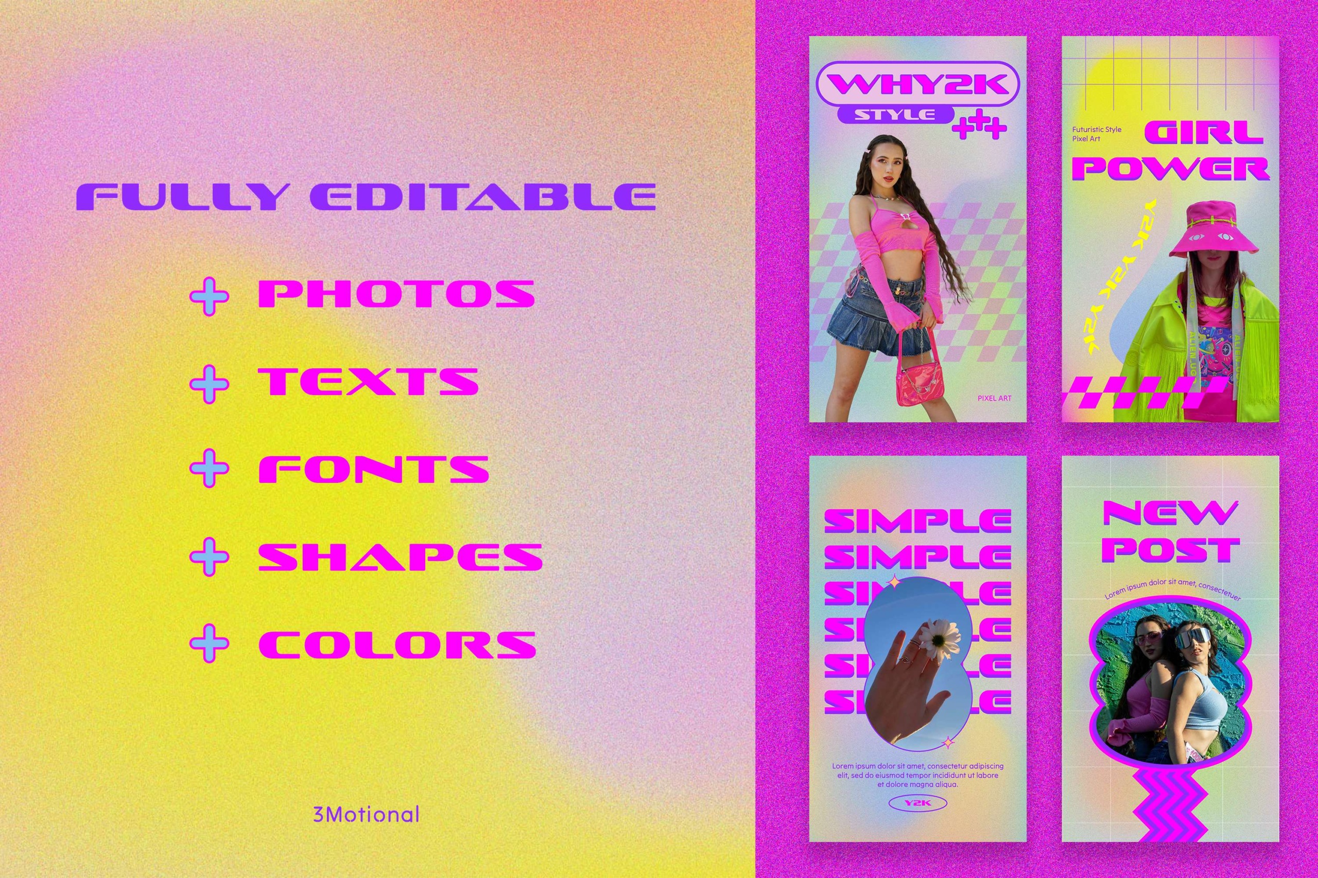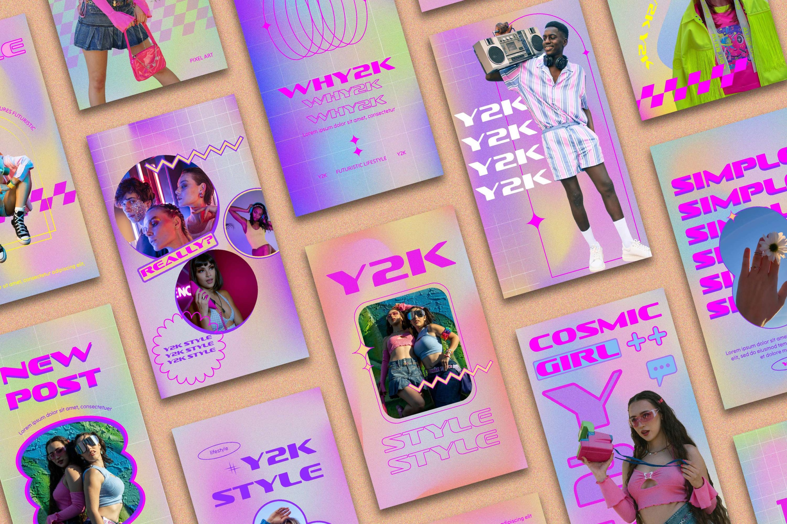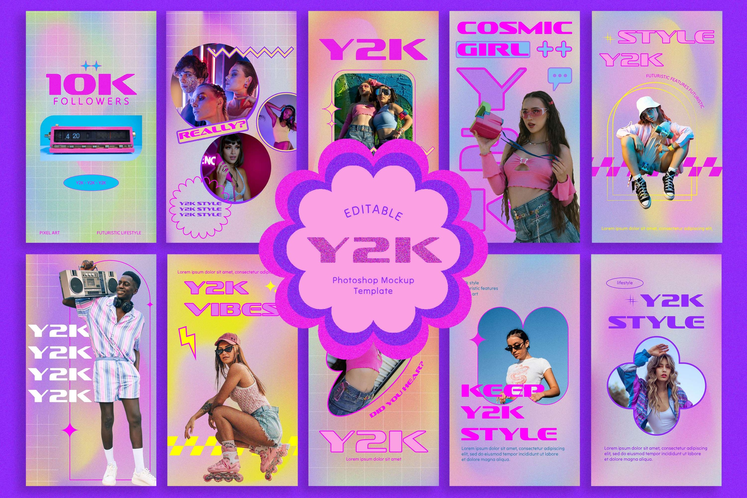 Enhance your online presence with our Y2K-inspired PSD mock-ups. These 15 high-quality templates (1080 x 1920 pixels, 300 DPI) seamlessly blend Pixel Art, Cyberpunk, and Kidcore aesthetics. Ideal for social media feeds, Instagram Stories, Facebook Stories, Pinterest Idea Pins, and product branding. Fully customizable with organized layers, these templates include Retro Futurism Elements, Geometric Shapes, Neon Colors, Pink Holographic Background, Futuristic Typography, 90s Glitch, and Bright Vintage. Please note that the images in the presentation are for preview purposes only.