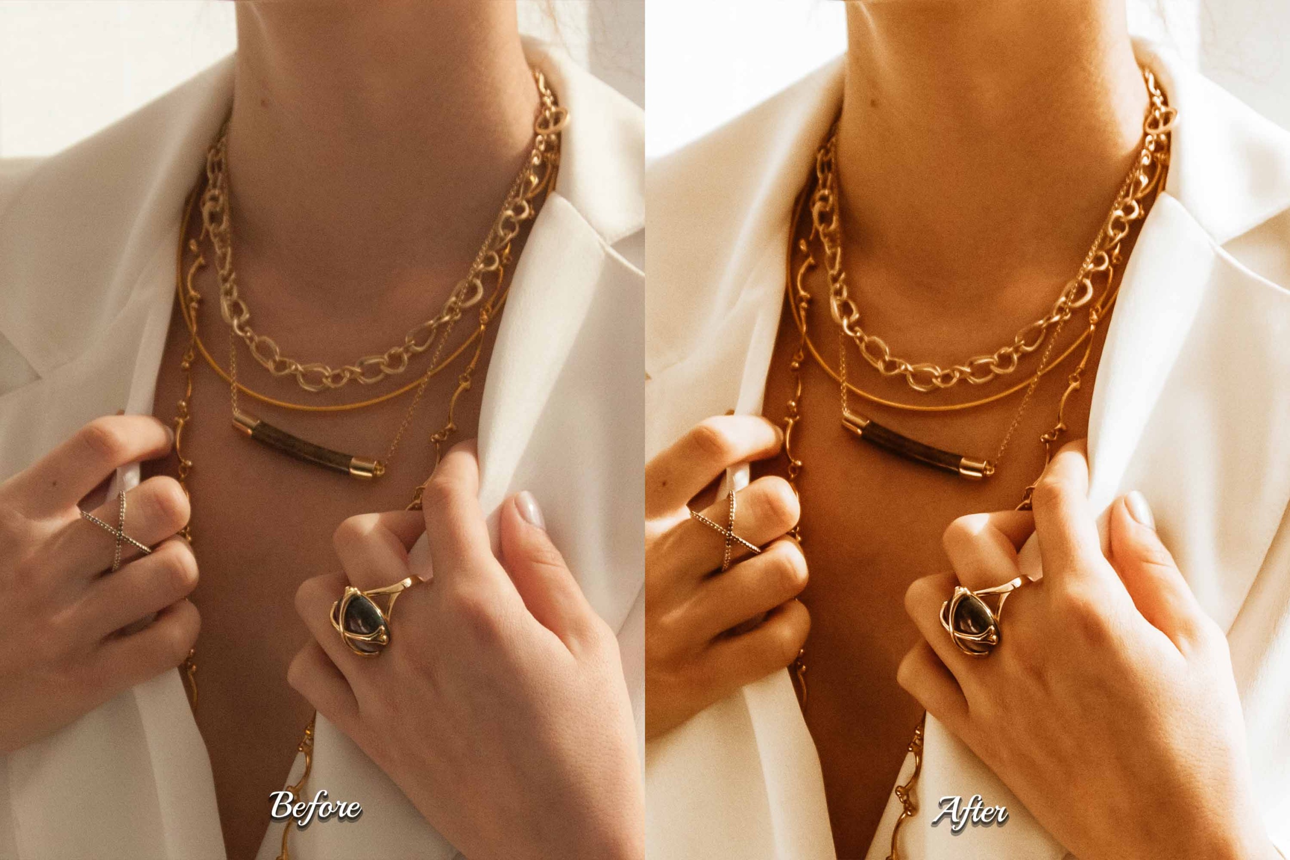 Transform your jewelry and gold accessory photos with our premium bundle. Includes 30 Desktop (XMP) & 30 Mobile (DNG) presets, plus a help guide. Perfect for vintage, luxury, classic, and indoor photos. It is ideal for photographers, influencers, bloggers, and artists seeking chic, shiny, and glamorous golden vibes. Enhance portraits, rings, and lifestyle shots effortlessly. Suitable for beginners and professionals, this collection adds sparkle, shine, and luxe light to your images.