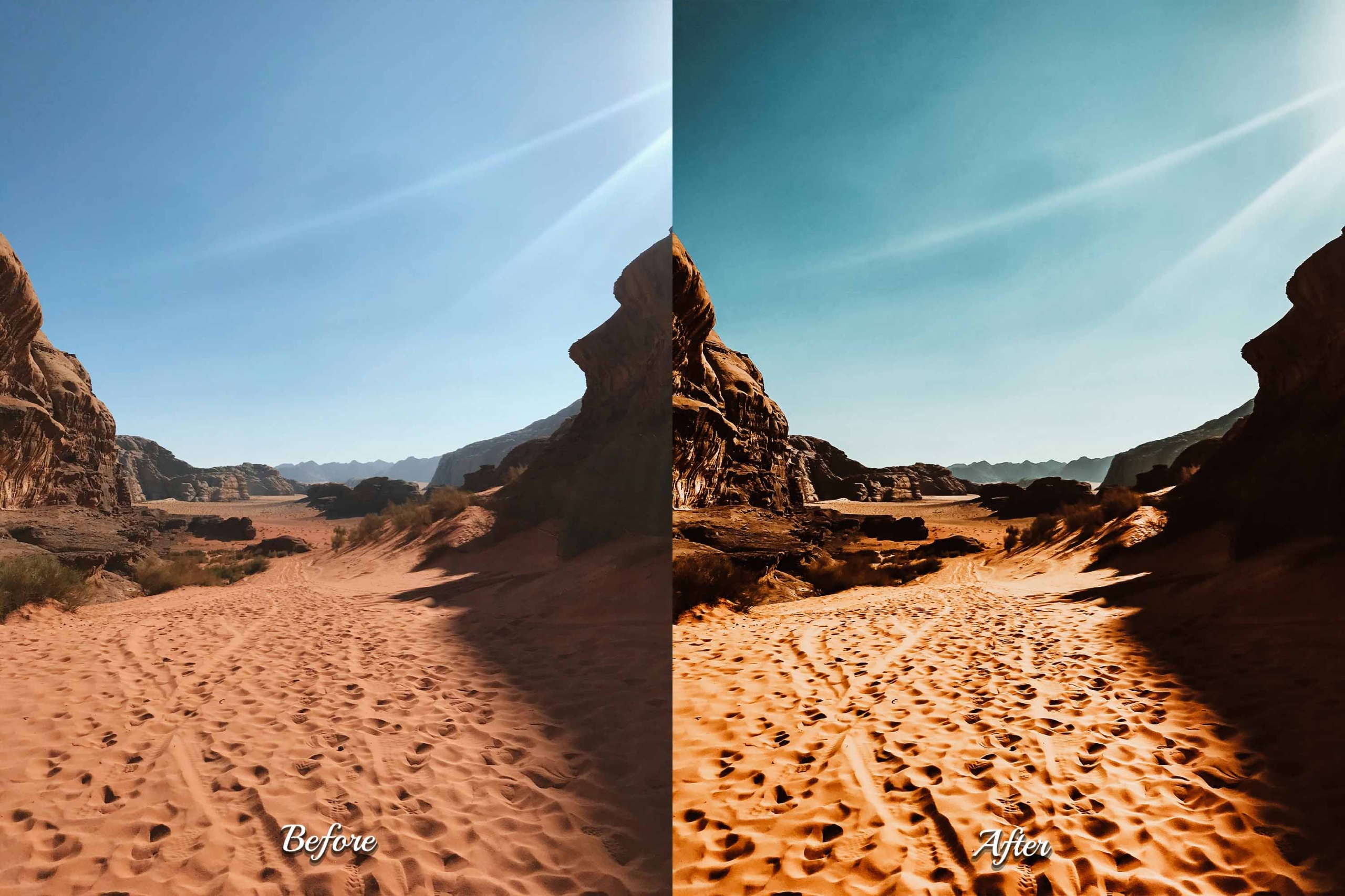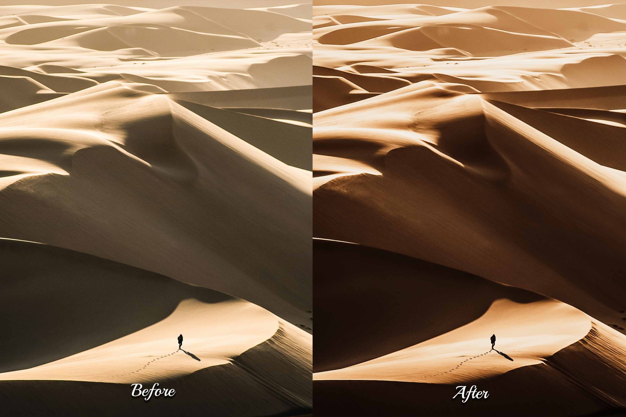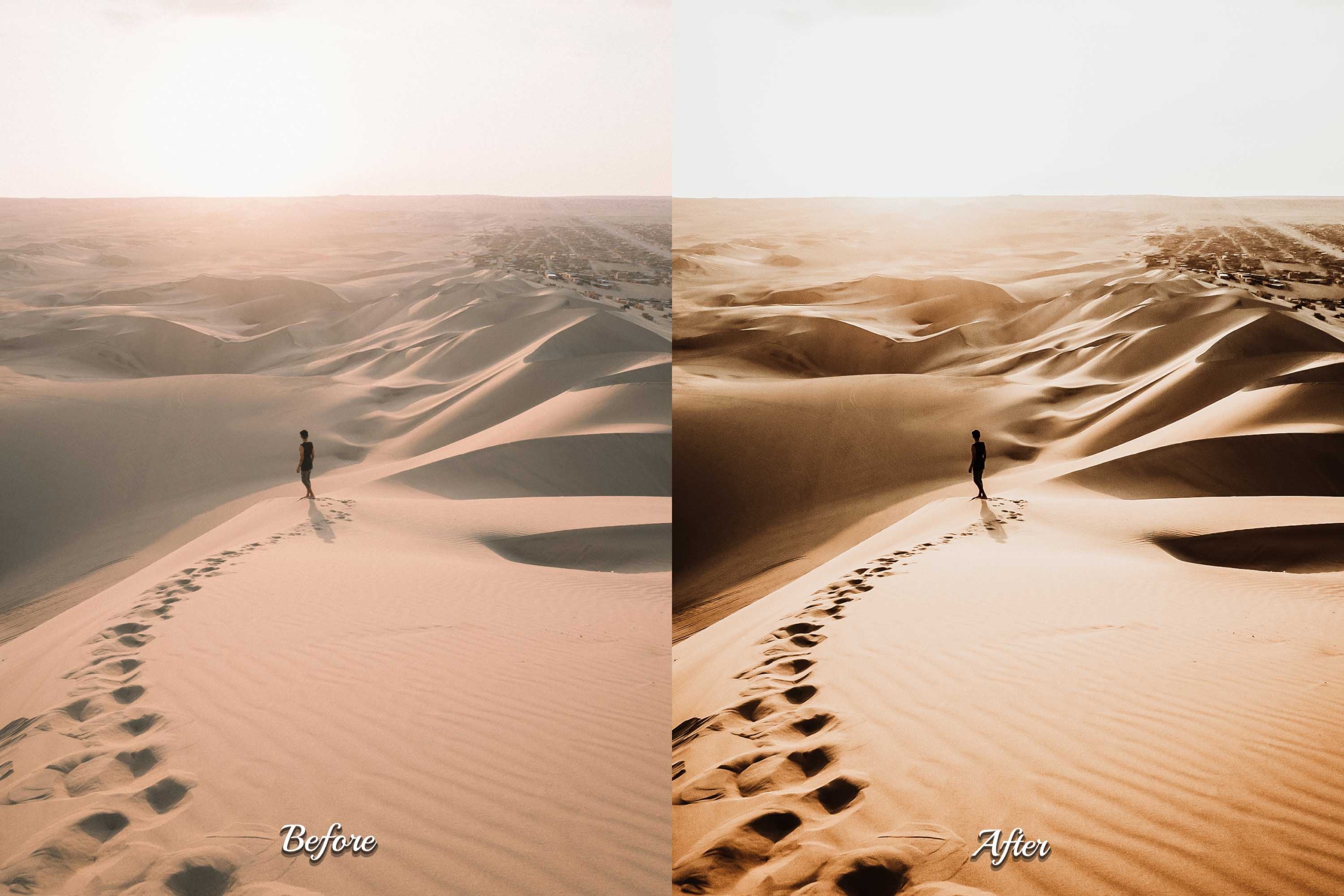 Enhance your desert adventures with Mirage Lightroom Presets. This bundle features 30 Desktop (XMP) and 30 Mobile (DNG) presets, perfect for landscapes, travel, dunes, and nature photography. Elevate your Instagram posts and achieve stunning golden hour effects. With themes like Desert, Orange & Teal, Bright, Warm, and more, this collection adds depth, vibrancy, and a touch of bronze. Suitable for bloggers, influencers, photographers, and anyone seeking the best desert vibes. Unleash your creativity and bring your Sahara and desert images to life!