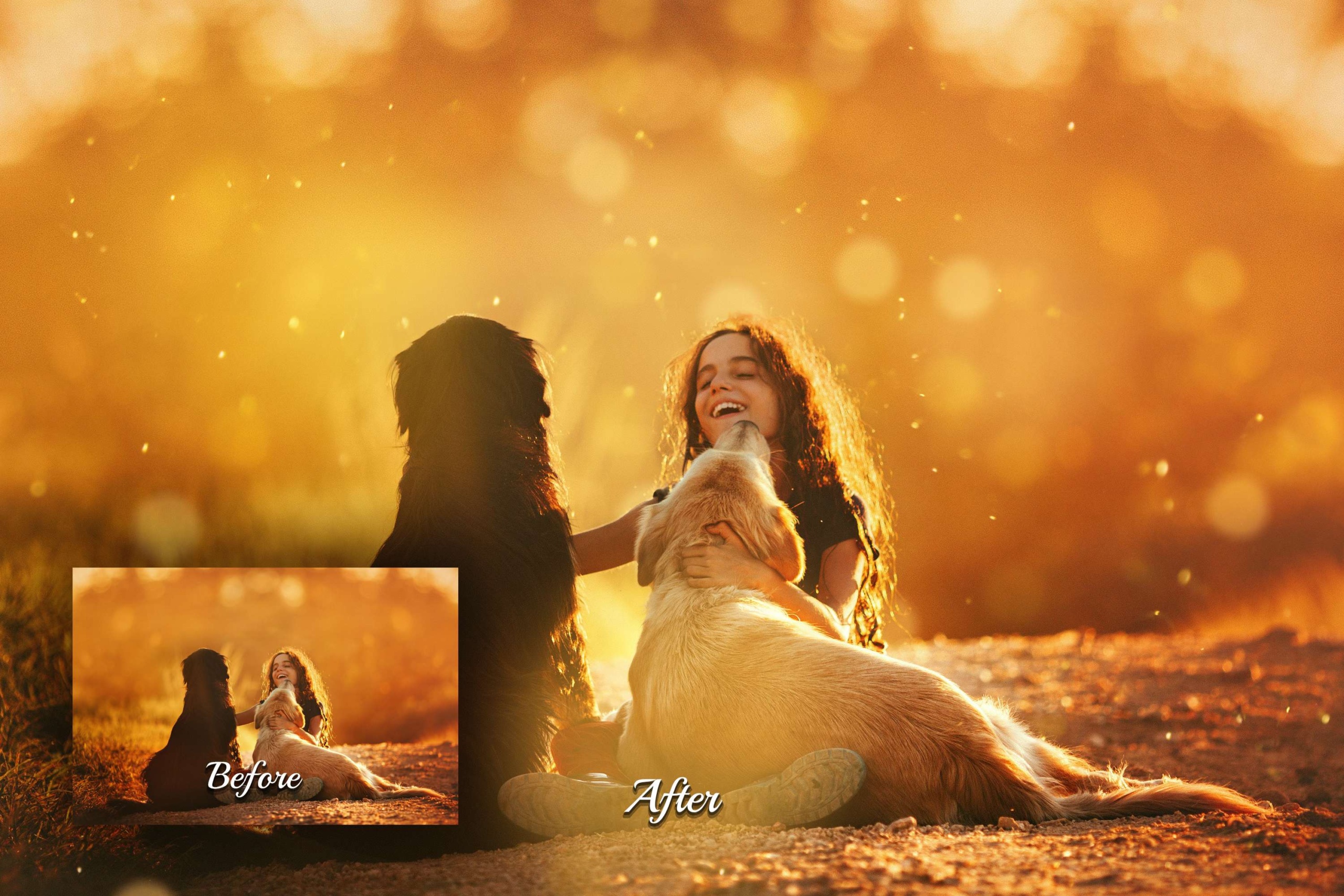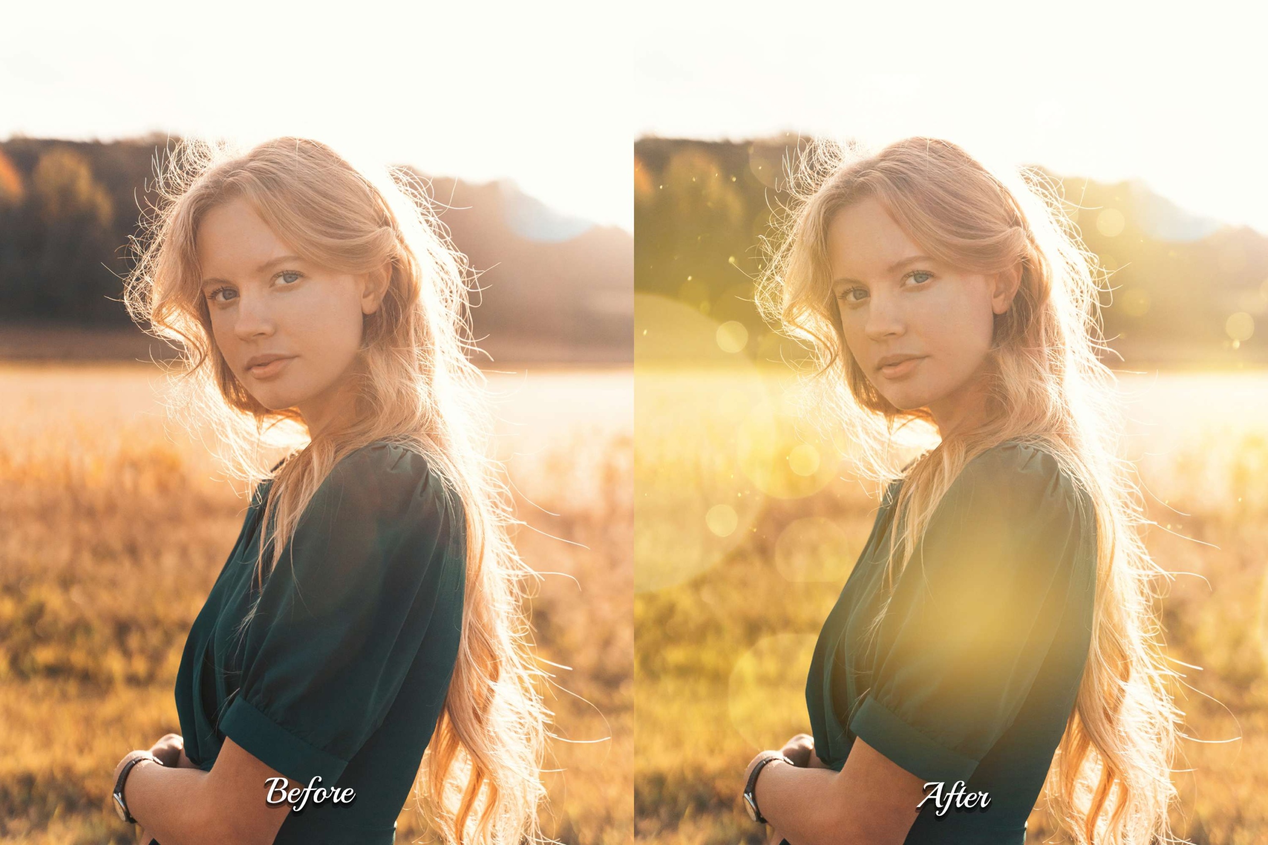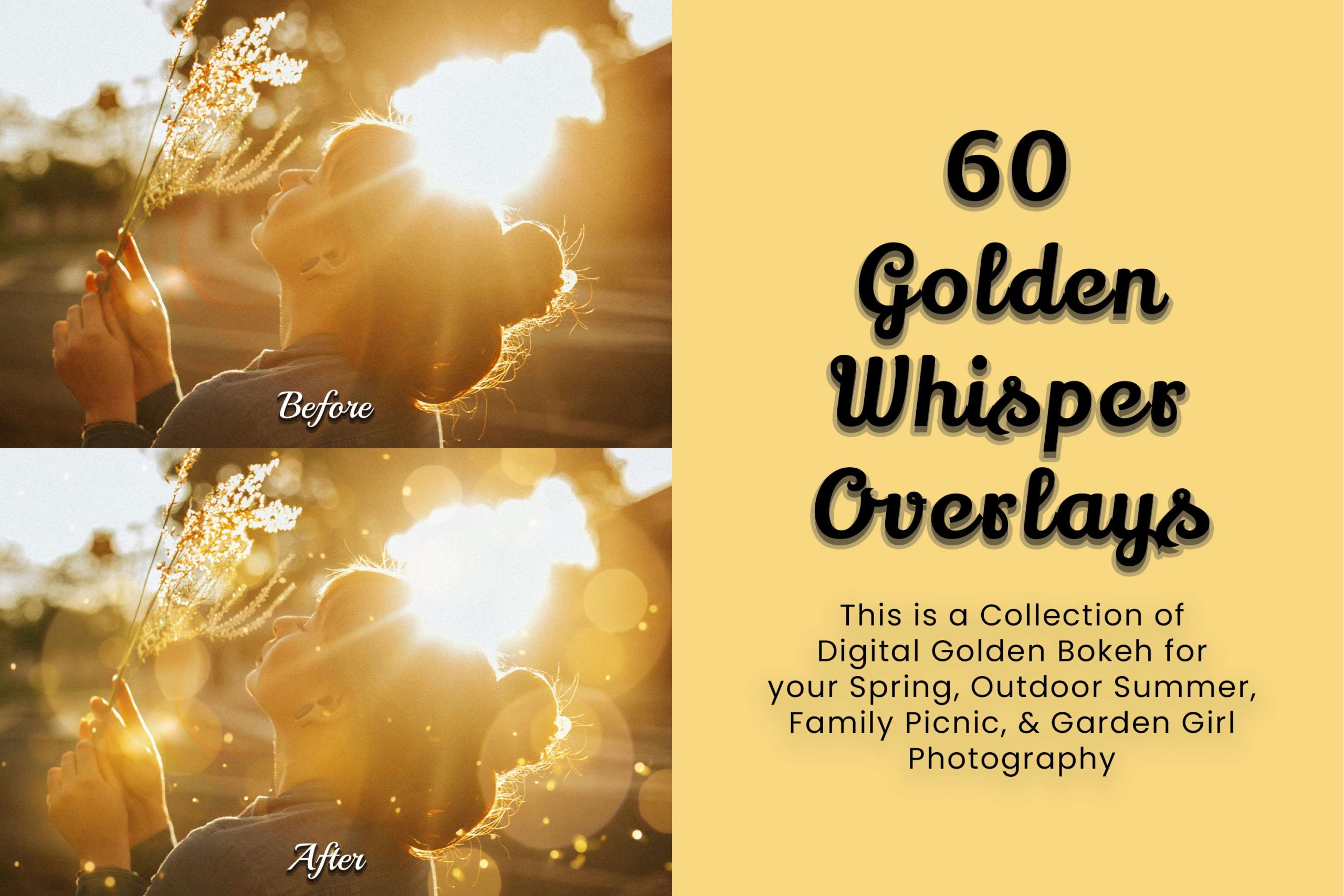 Elevate your photography with our Golden Whisper Photoshop Overlays. This pack of 60 high-quality JPG overlays infuses your images with realistic gold bokeh lights, creating a natural sunlight bokeh backdrop. Add shine beams, a glow sun flare background, glitter sunshine filter, and a touch of digital light leak effect. Perfect for outdoor portraits, summer sunrises, couples, travel bloggers, influencers, nature shots, children, landscape, wedding photography, golden hours, spring family, and garden girl’s images. Transform ordinary outdoor scenes into captivating fine art compositions!