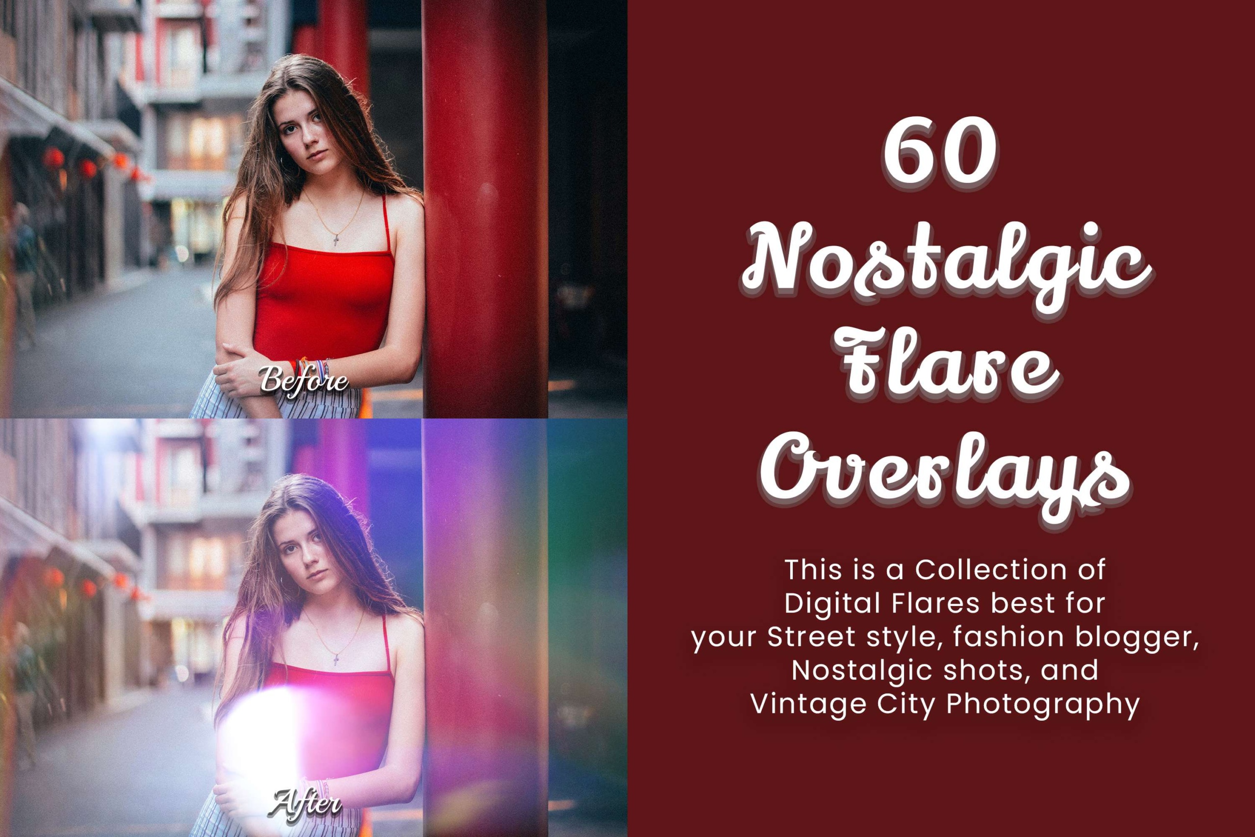 60 Nostalgic Flare Overlays, Sun Flare, Glow Dust, Natural Lens, and Light Leak for Vintage Style, Nature, and Travel Bloggers