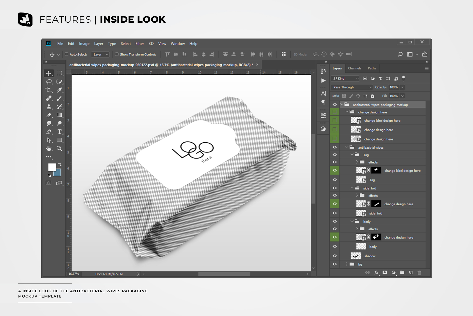 The wipes branding mockup is entirely customizable and has layers that are well-organized.