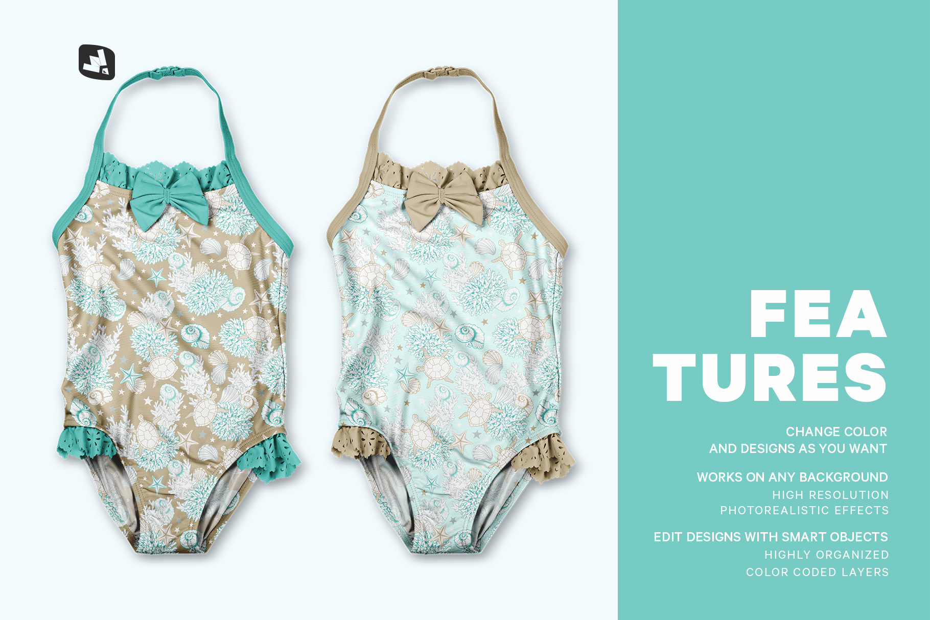 Cute baby swimsuits are a great way to showcase fun refreshing pattern designs. This backless baby swimsuit mockup is trendy, cute and an efficient option to have in your hands while presenting any fun patterns.This backless baby swimsuit mockup has a 300 DPI base image and a natural photo-realistic effect. All the layers of this kid’s swimsuit mockup are perfectly organized and color-coded and fully customized to match your pattern designs perfectly.A detailed guide video is provided with this swim apparel mockup to help you edit faster and better.Features: