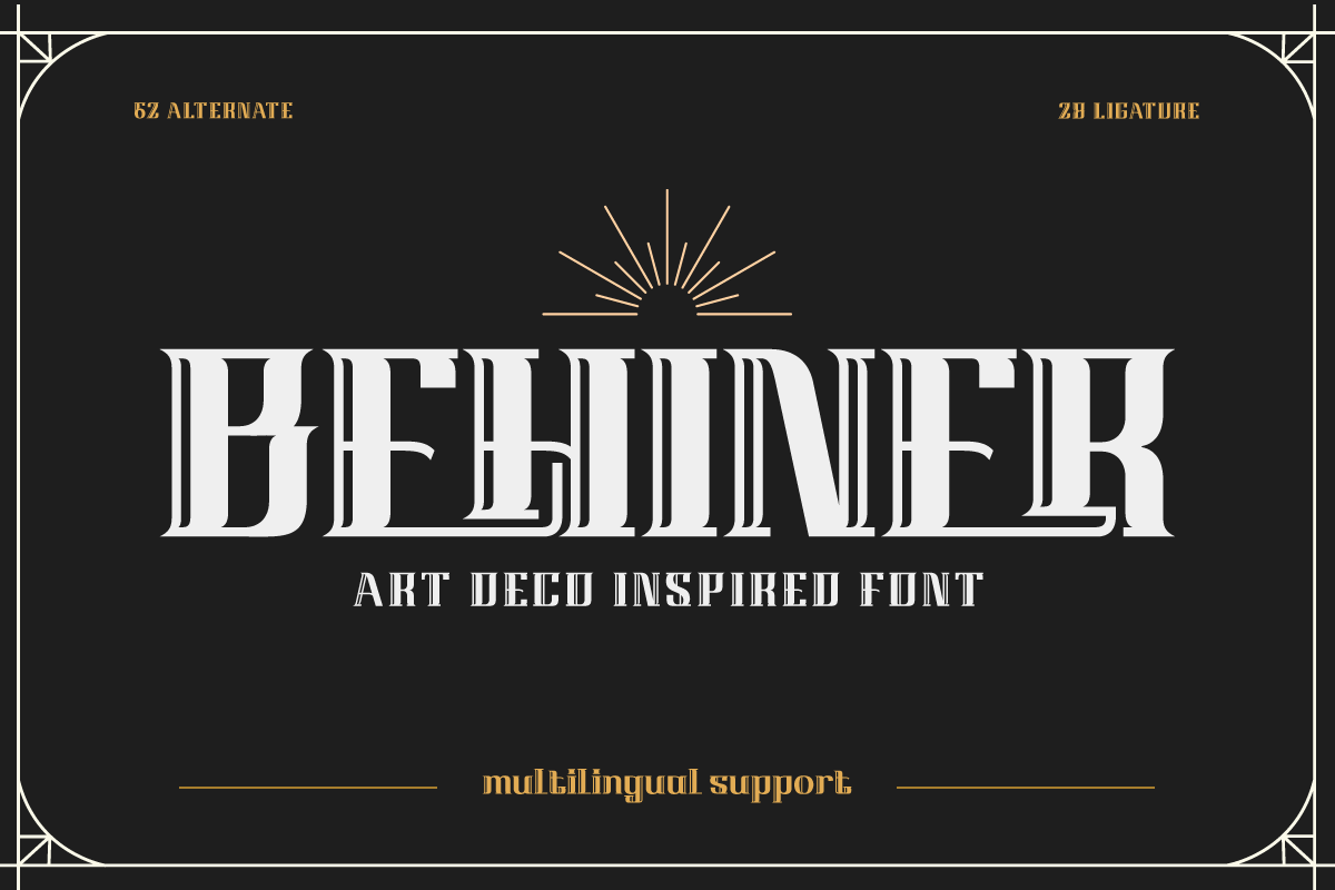 Use Behiner to infuse your posters, ads, branding, or editorial designs with the classic glamour of the Art Deco era — now reimagined for the modern world. With multilingual support and seamless compatibility across platforms, it’s as functional as it is beautiful.