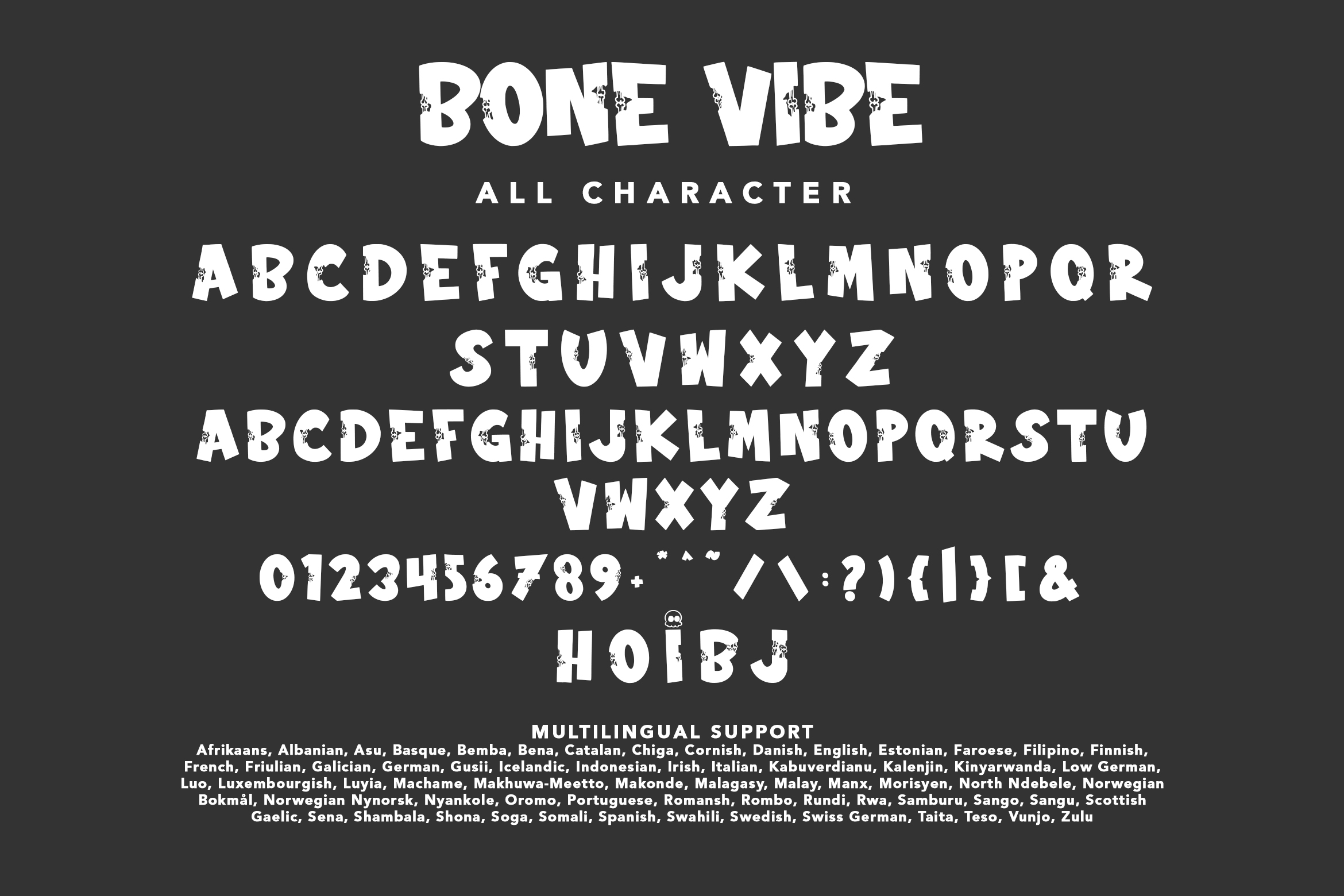 Bone Vibe carries a unique and edgy aesthetic, with letter characters inspired by the shape of bones or skeletal structures. This font can depict a dark, mysterious, and stylish impression, suitable for use in designs that want to highlight horror, gothic, or underground themes.
