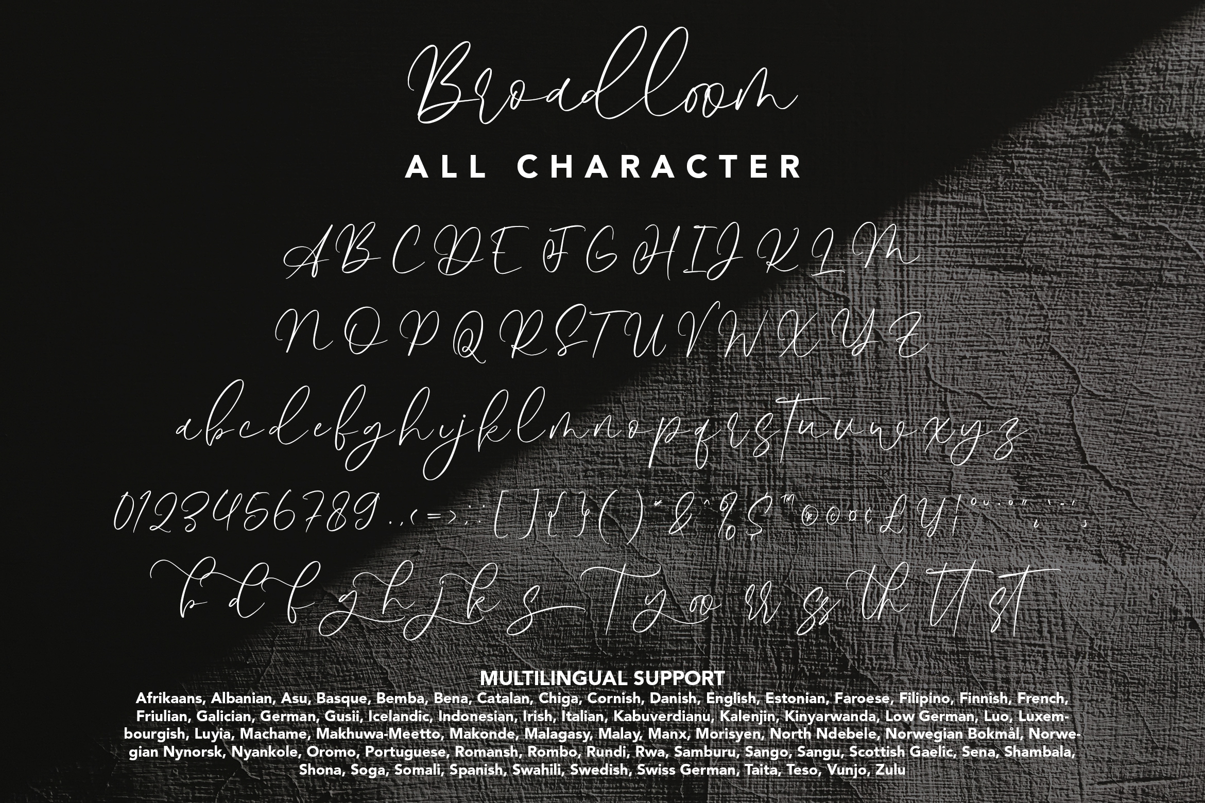 Broadloom is a Beauty Calligraphy Font. An elegant and sophisticated typeface, designed to exude timeless charm and refined artistry. Its smooth, fluid strokes mimic the elegance of traditional handwritten calligraphy, making it perfect for luxury brands, wedding invitations, and high-end design projects. Each character is crafted with precision, balancing subtle curves with bold touches, creating a harmonious blend of softness and strength. Whether you want to add a touch of class to your design or create a romantic and vintage atmosphere, the Broadloom Beauty Calligraphy Font captures the essence of elegance with every letter.