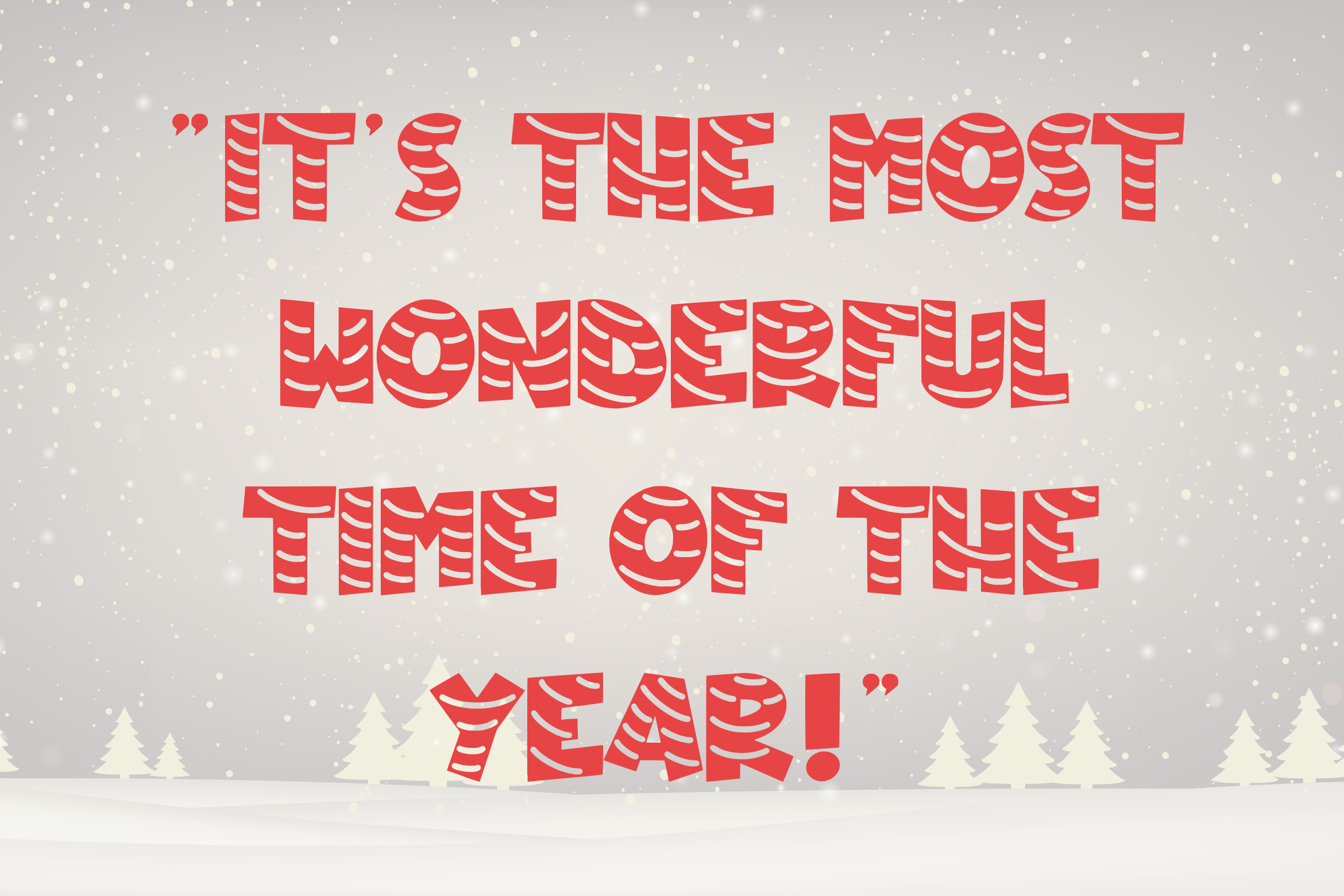 Christmas Candy is a display typeface designed to convey the cheerful and sweet spirit of Christmas. Inspired by colorful candies, this font brings the warmth and joy of Christmas into every letter it is used on. The gently curved letterforms with accents such as candy canes and Christmas tree ornaments make this font perfect for a variety of seasonal designs.