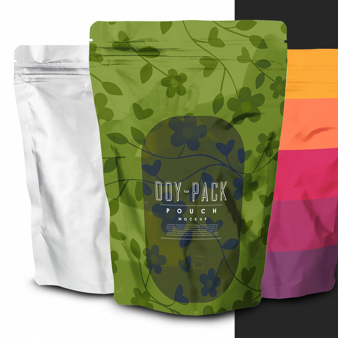 This high resolution doy pack foil packaging template comes with easy to edit Photoshop Smart Object feature and photorealistic presentation for your personal presentation for your client.