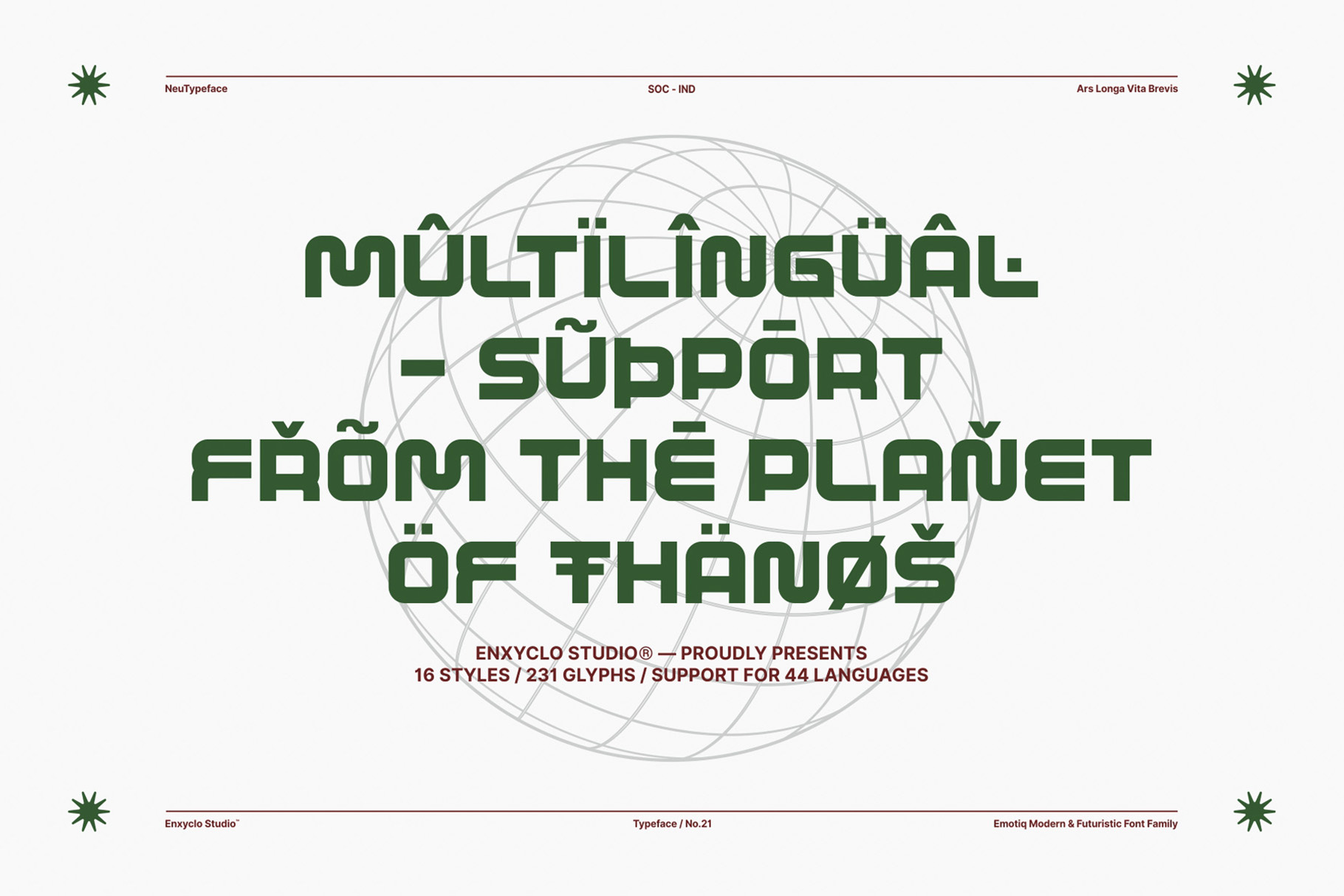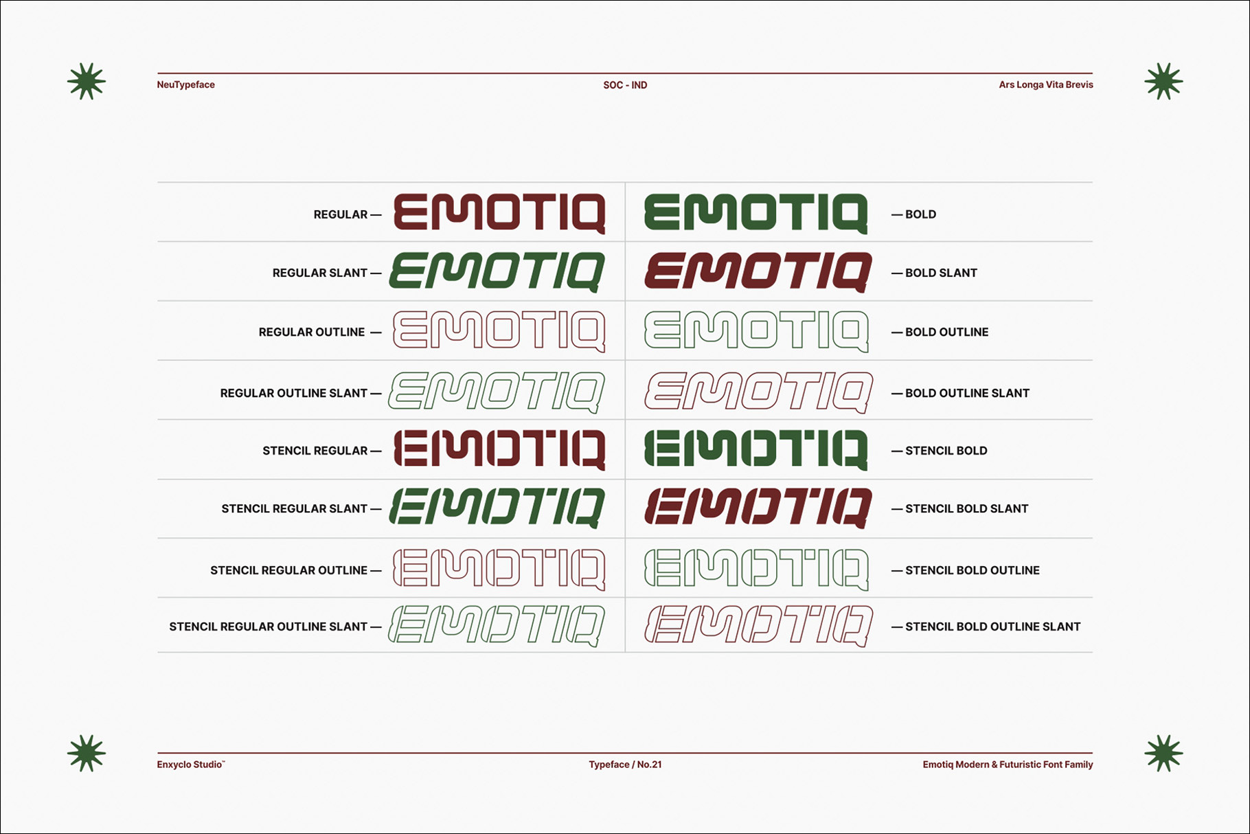 EMOTIQ is modern and futuristic sans display font with multiple styles. With this unique typeface, you can be even more expressive in your design projects. It is perfect for headline, billboard, magazines, website, titles, poster, branding, and logos. With this beautiful font, absolutely you can make your project stand out from the rest. See the previews above to get some inspiration on how to use them.