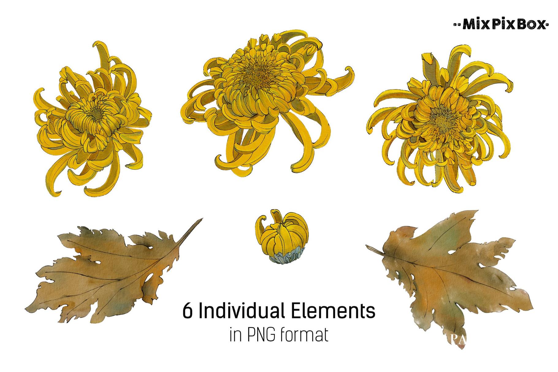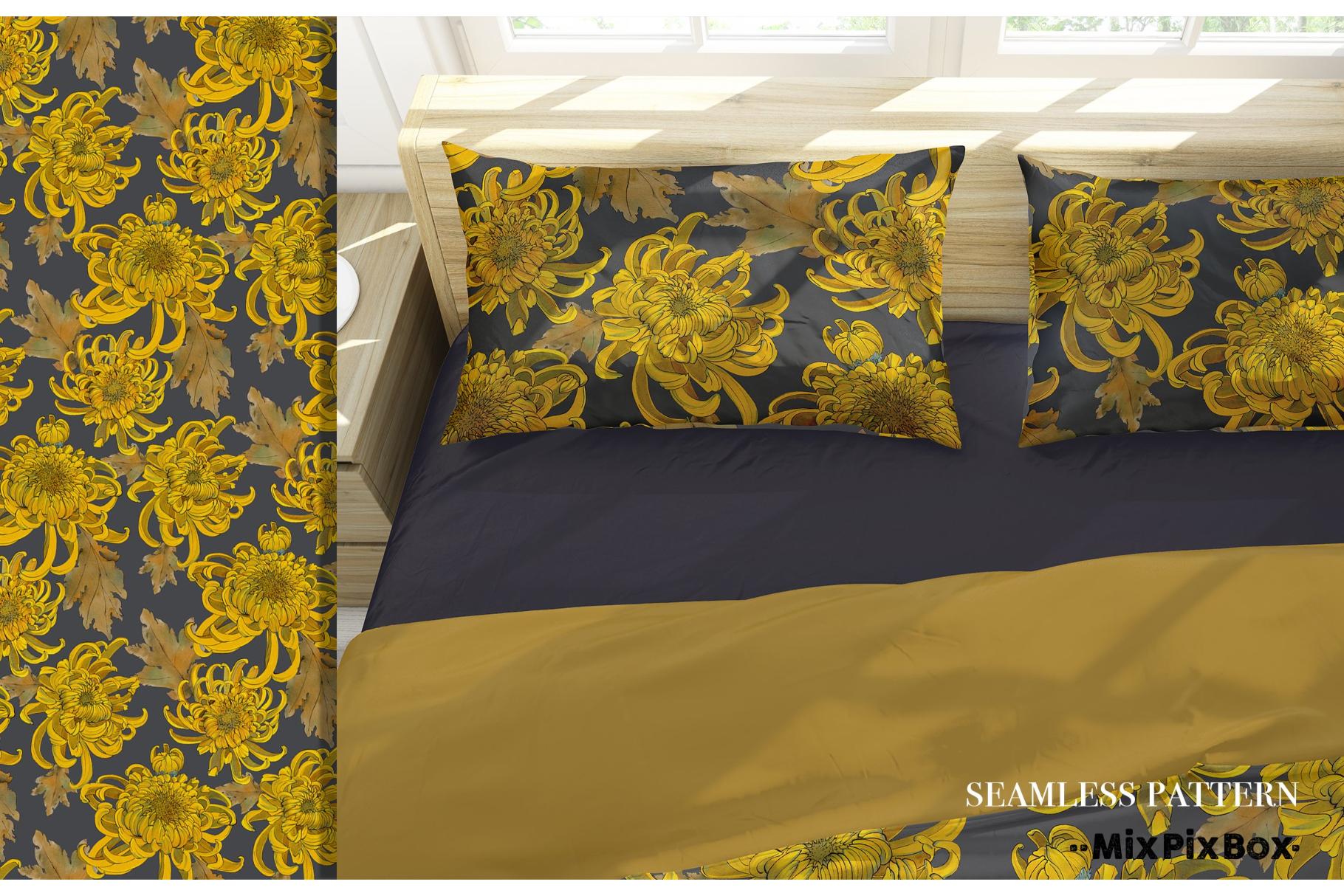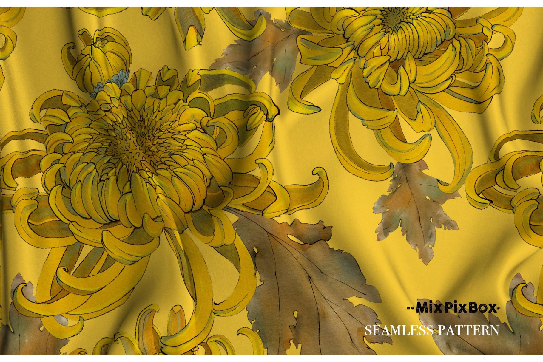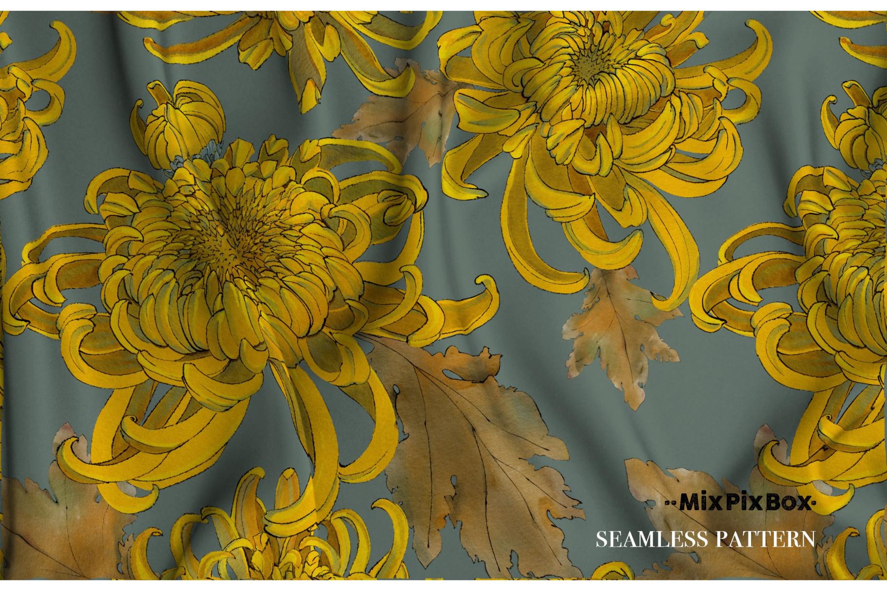 Golden chrysanthemum – seamless pattern set includes: