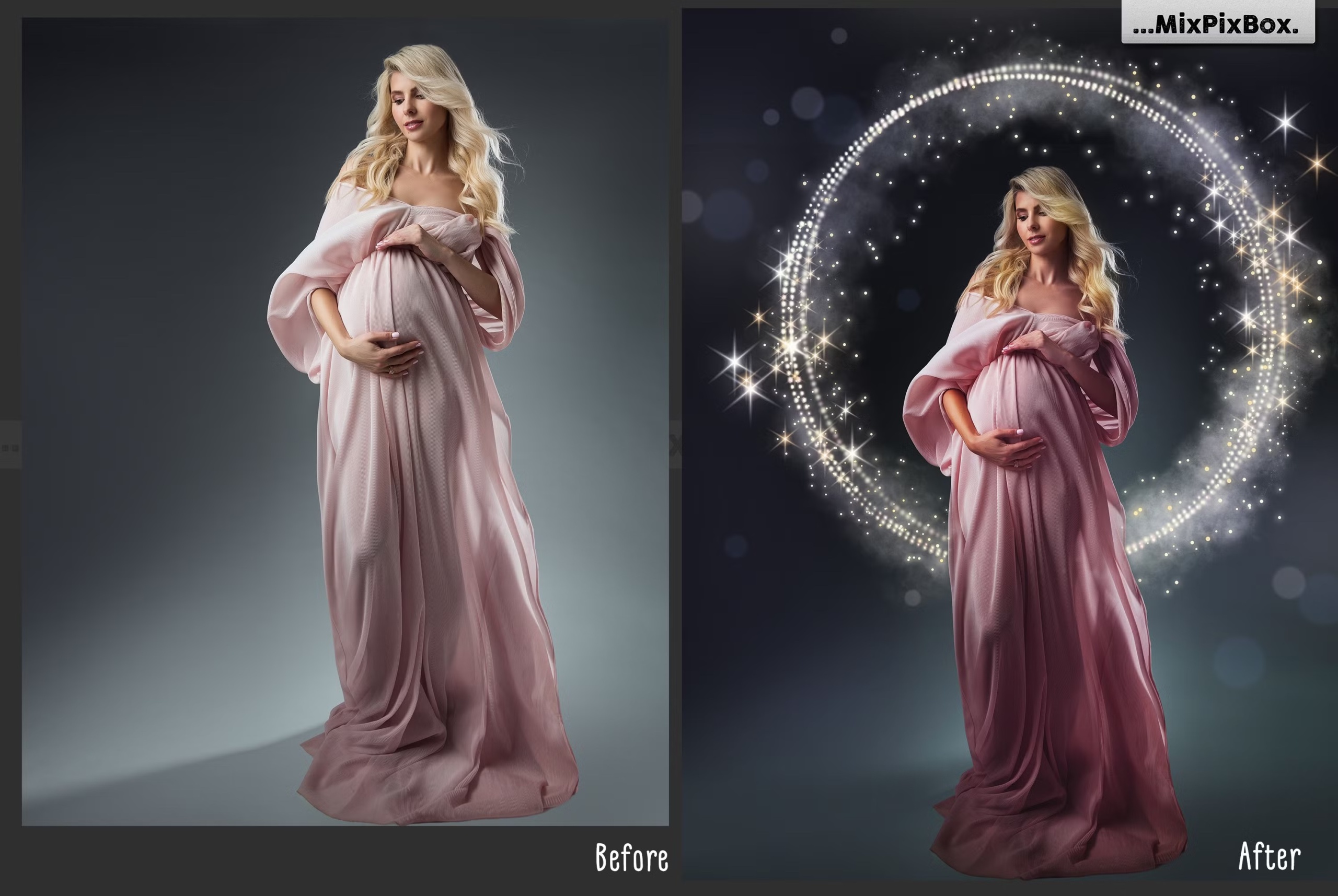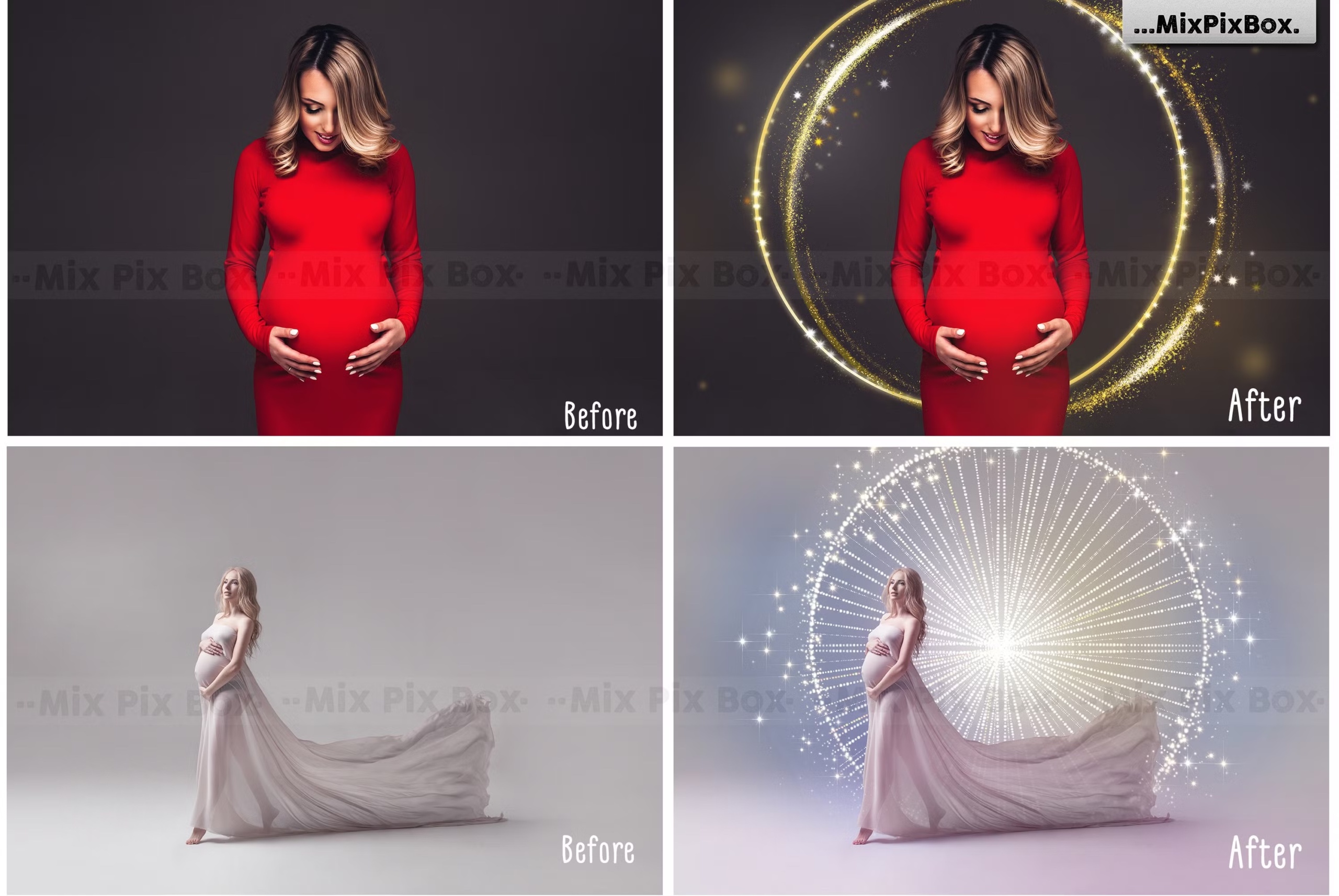 Introducing our product, “Golden Sparkling Ring Overlays.” These PNG files are incredibly user-friendly, allowing for seamless experimentation with layer blending modes such as “screen.” Customize effortlessly by adjusting colors using the hue/saturation tool. Perfect for enhancing portrait sessions and magically transforming maternity photoshoots. Elevate your holiday projects and any image in need of a touch of magic and enchantment with this versatile product.