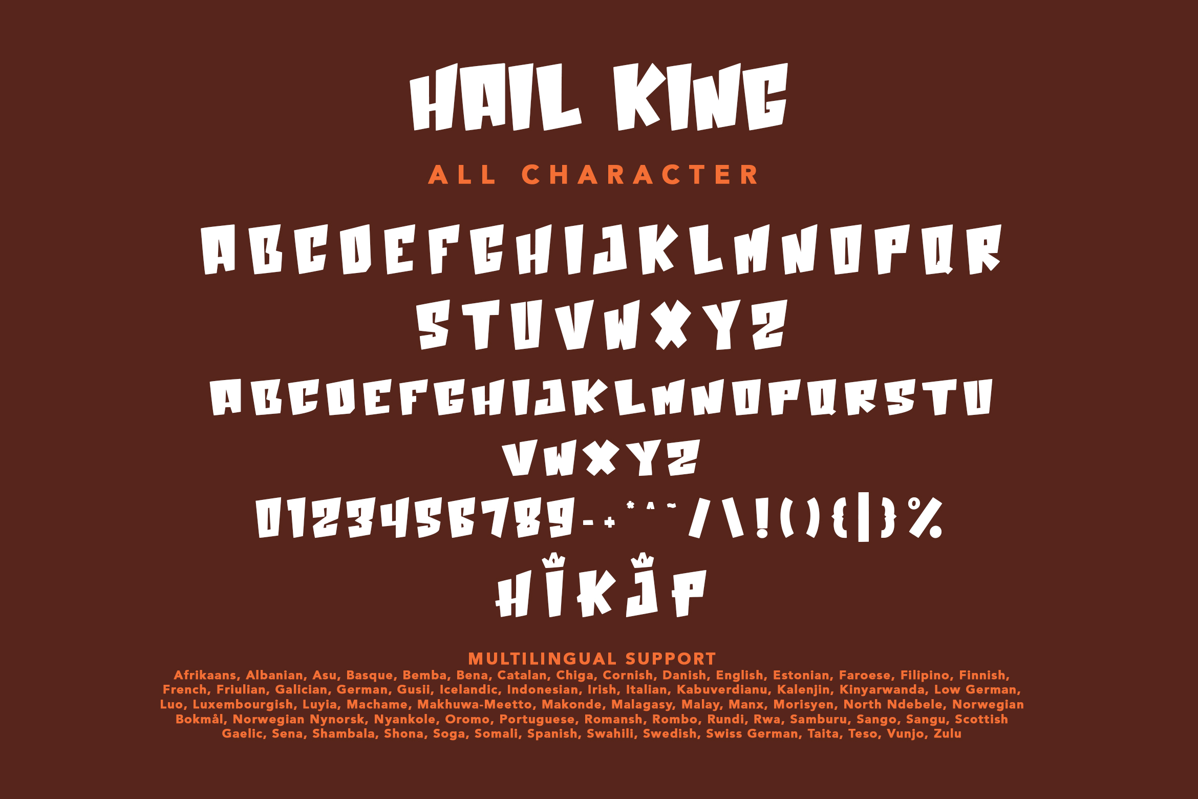 Hail King is a Comic Display Font. A typeface designed to showcase characters that are fun, expressive, and full of life, similar to the handwritten style often found in comics. With bold, linear, and often eccentric shapes, this font is designed to make a strong, clear impression when used in titles, typical comic text, or graphic designs with a comic feel.