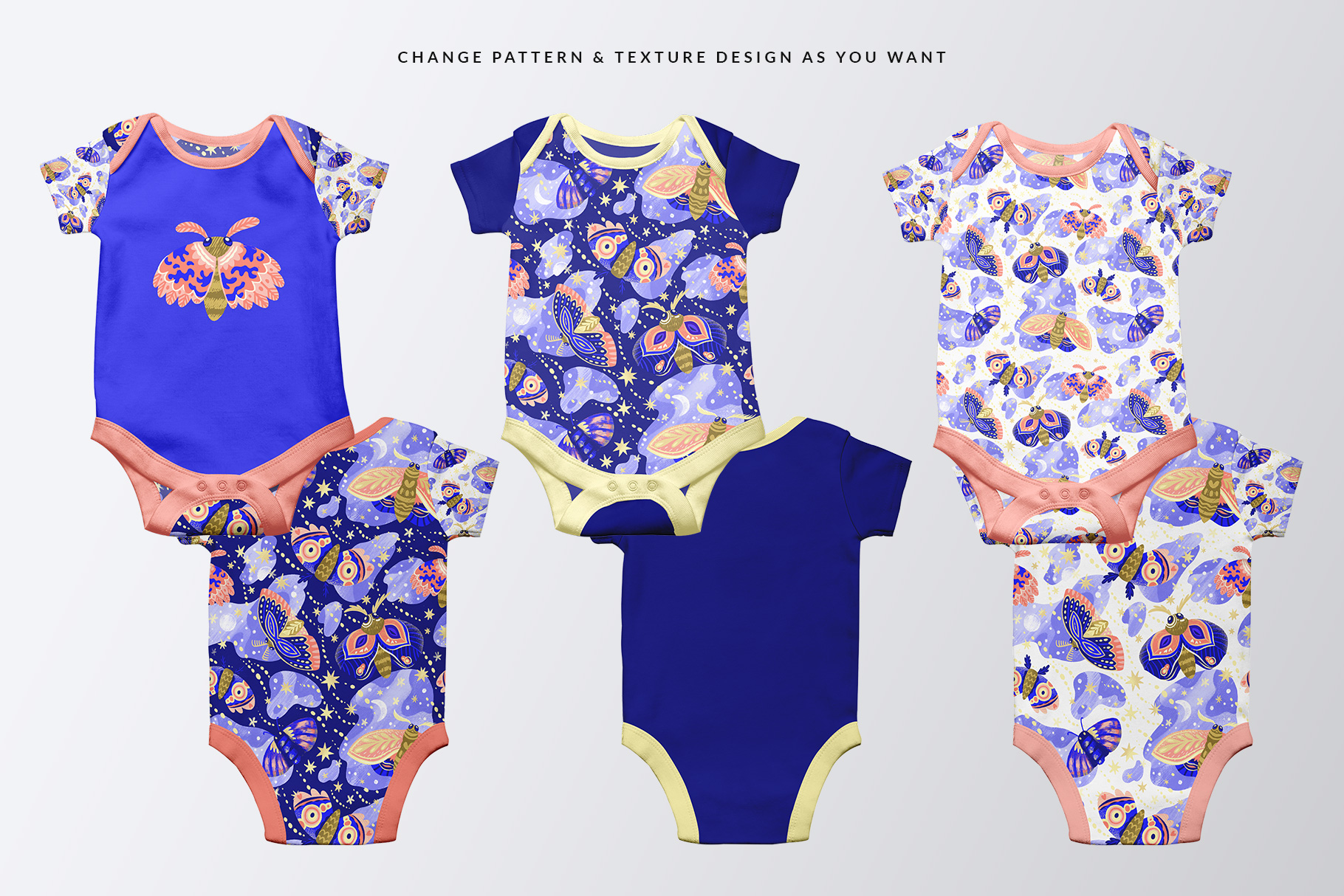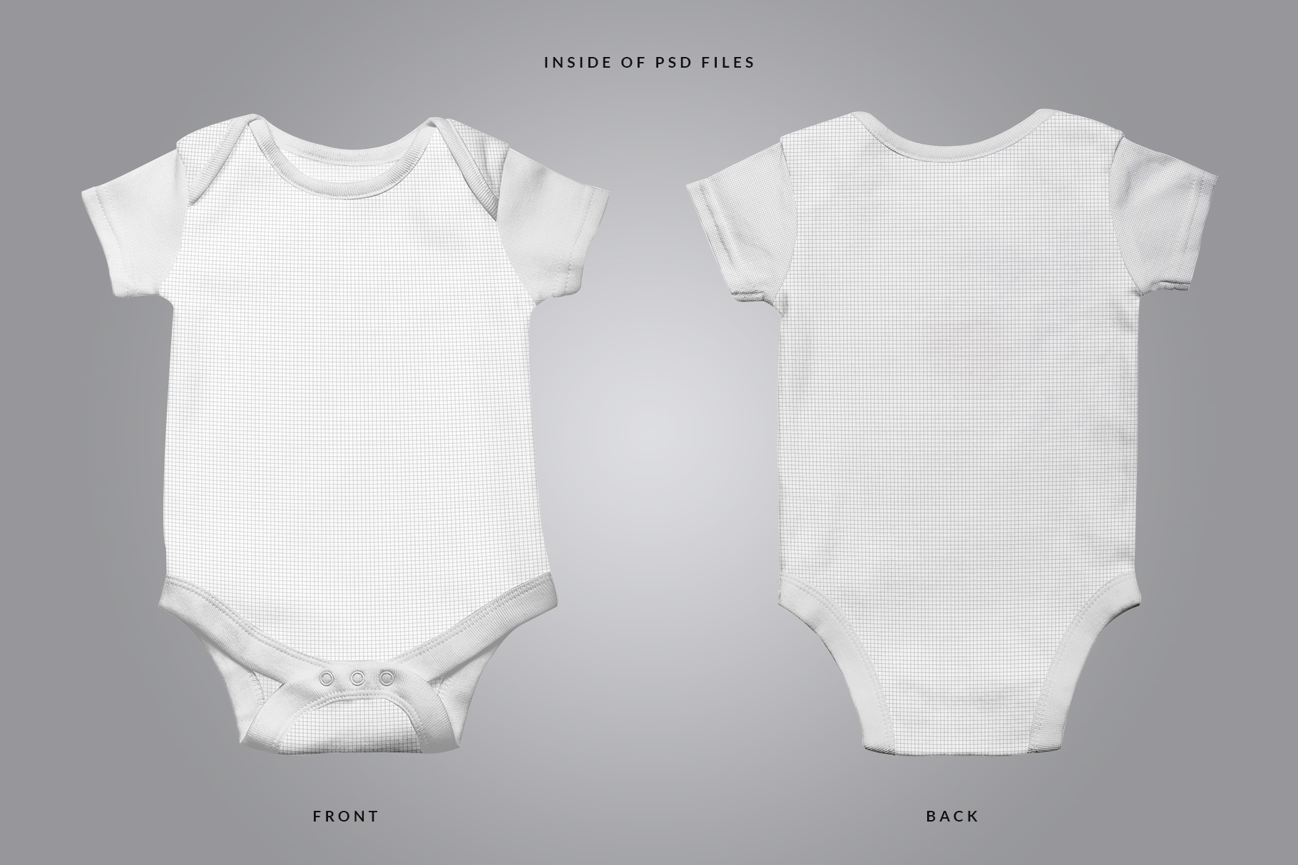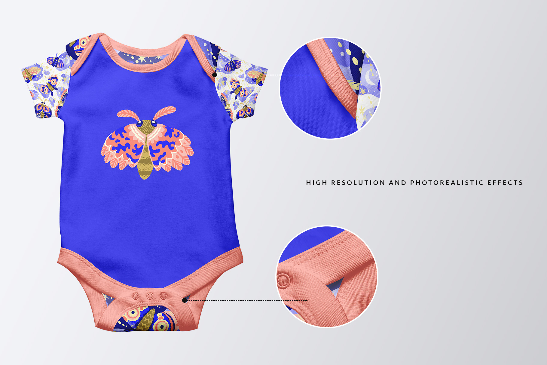 This amazing half-sleeve baby onesie mockup will upgrade your presentation quality of showcasing the cute and beautiful baby patterns and textures for baby clothes.