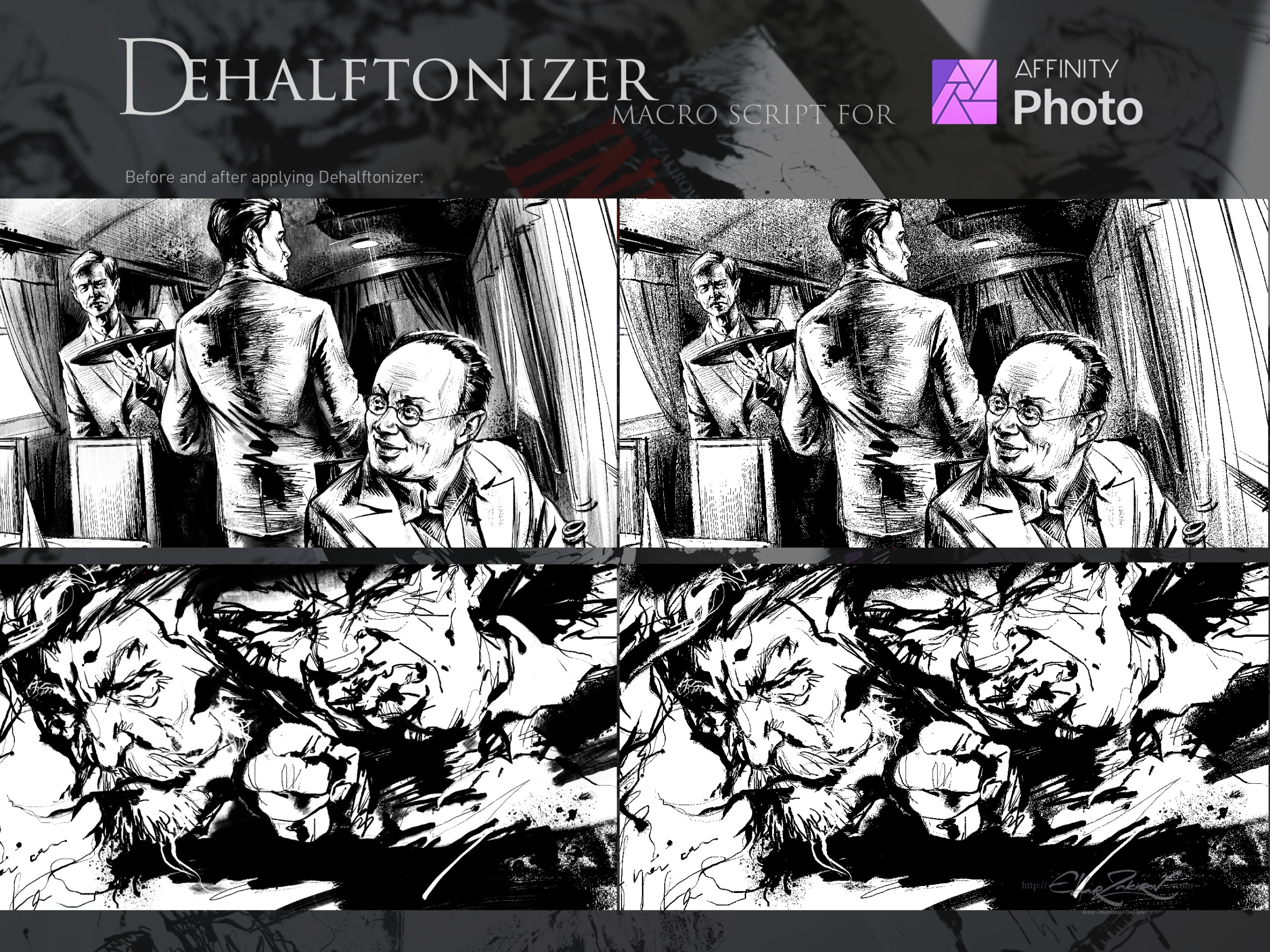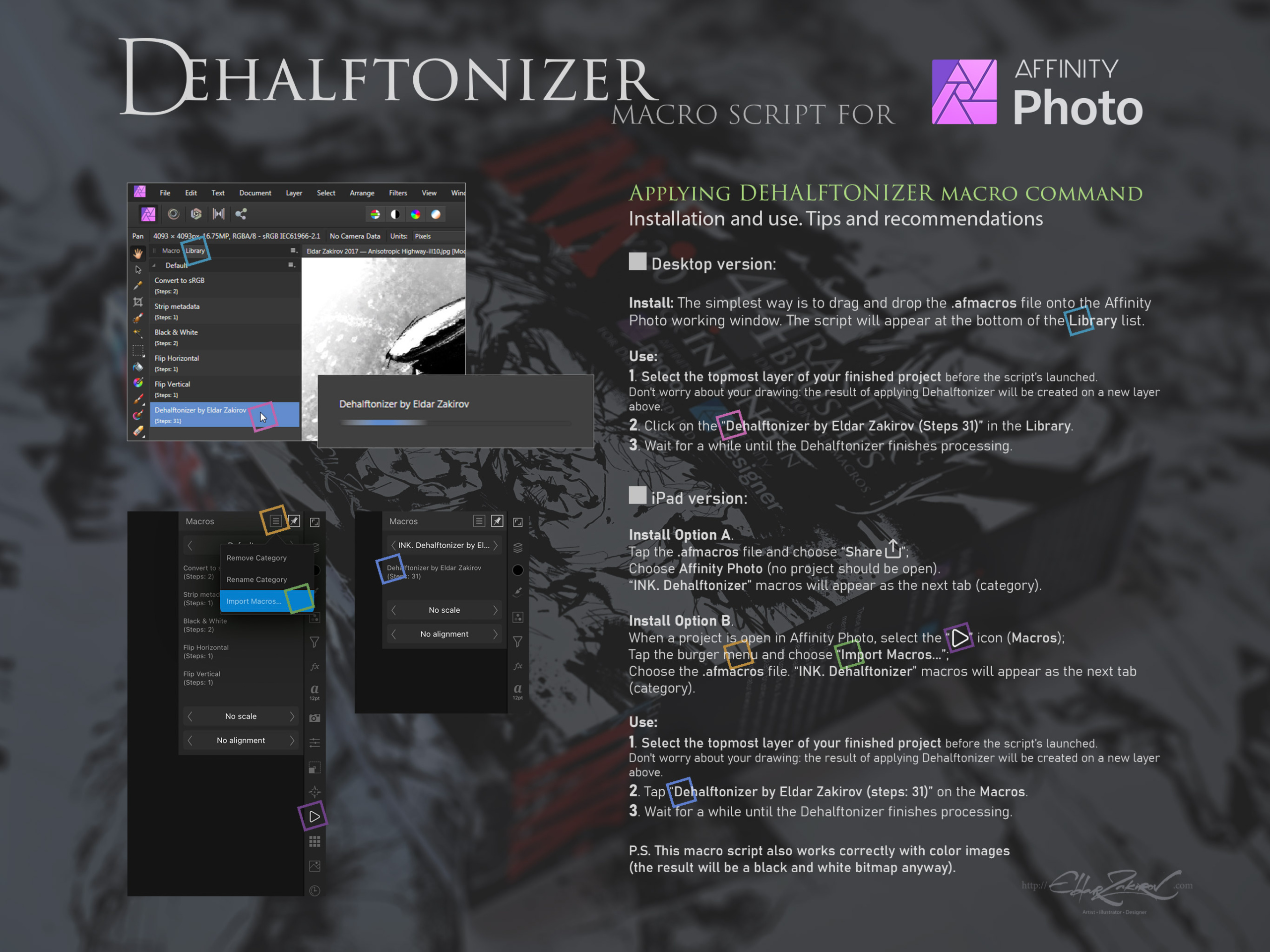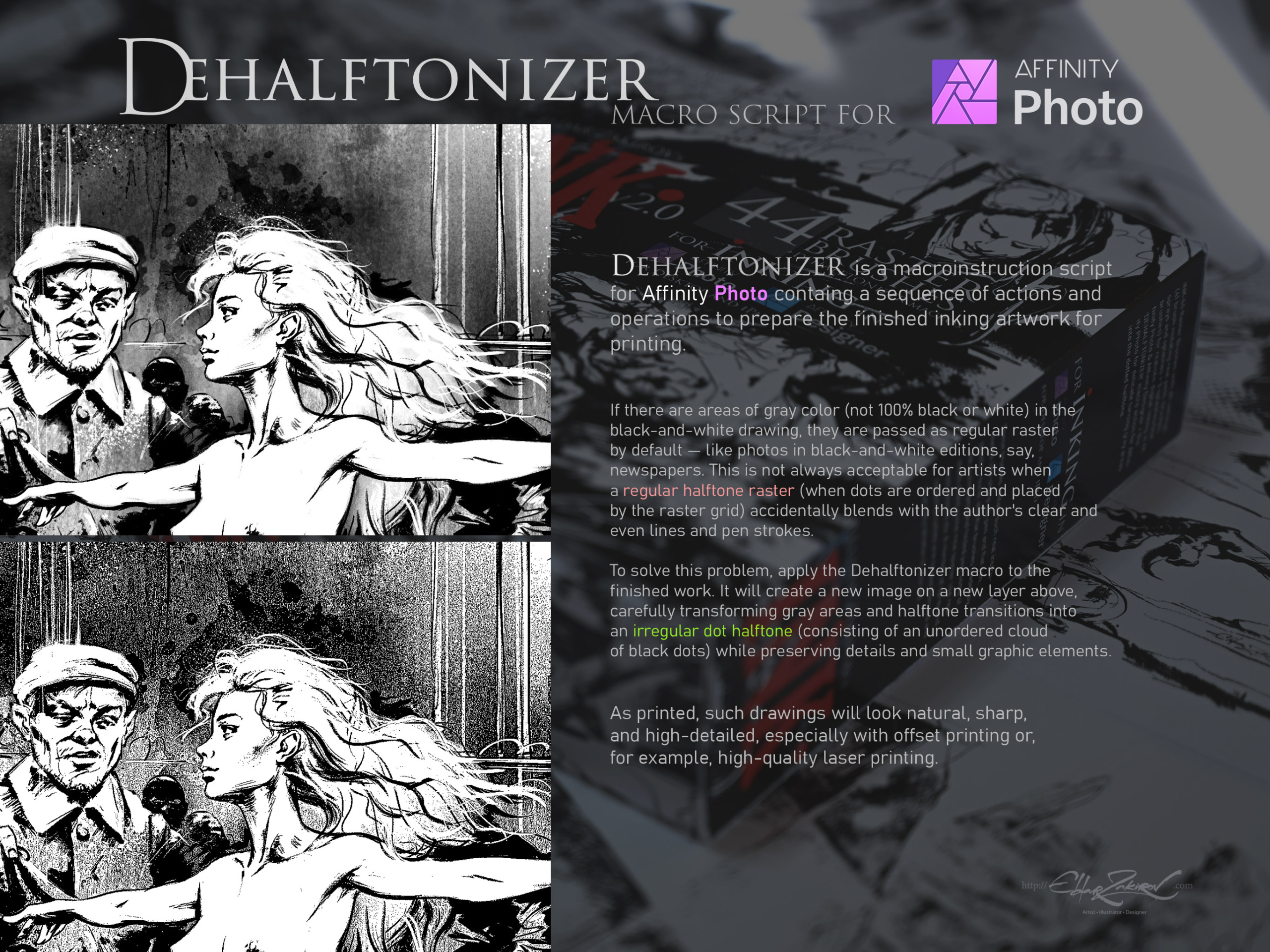 - INK. Dehalftonizer by Eldar Zakirov.afmacros. The macro action for turning gray areas to dotted halftones with 100% black or white for printing is saved as Library macros. This is a more convenient option than the previous one.