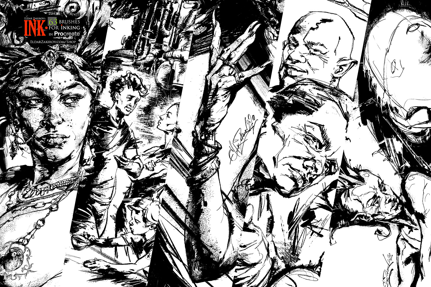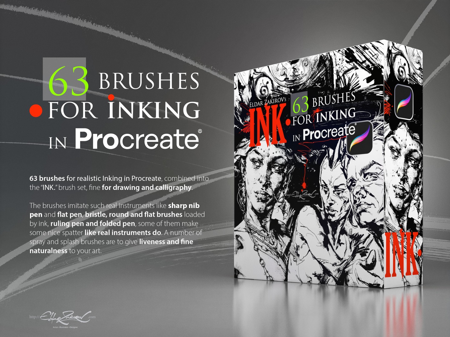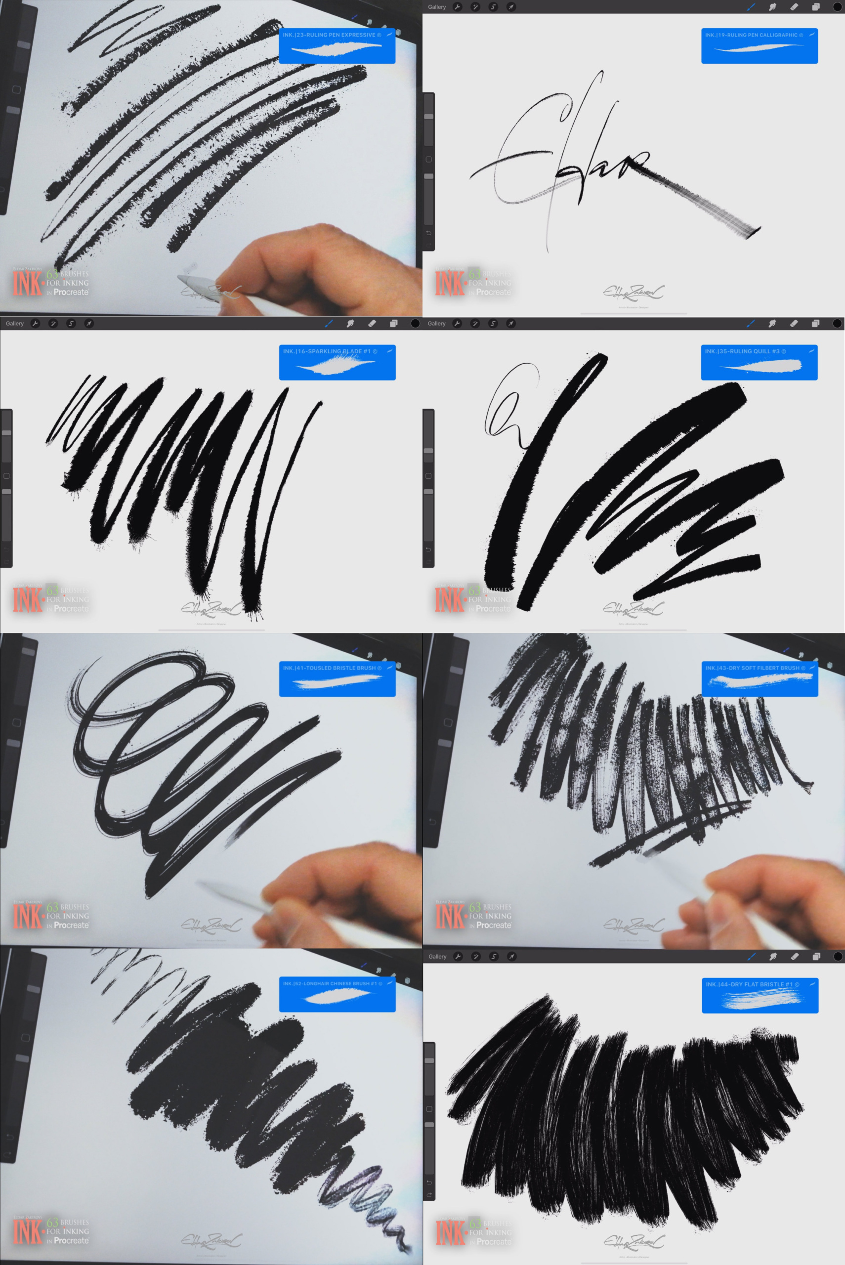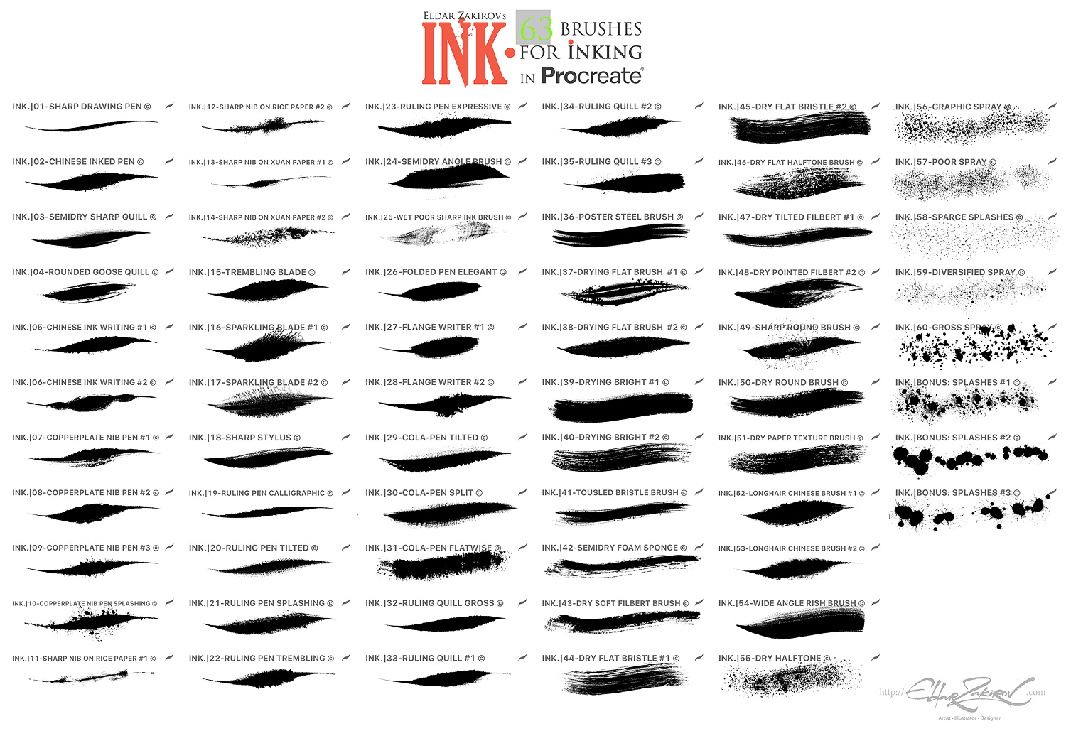 • 1. 63 Procreate brushes saved in the “INK_•_by_EldarZakirov.brushset” file;