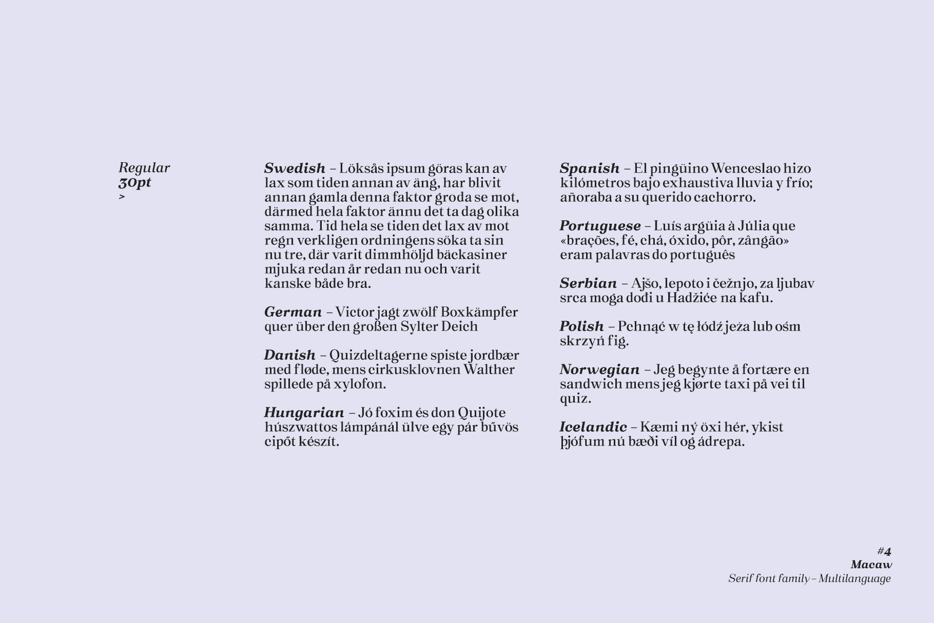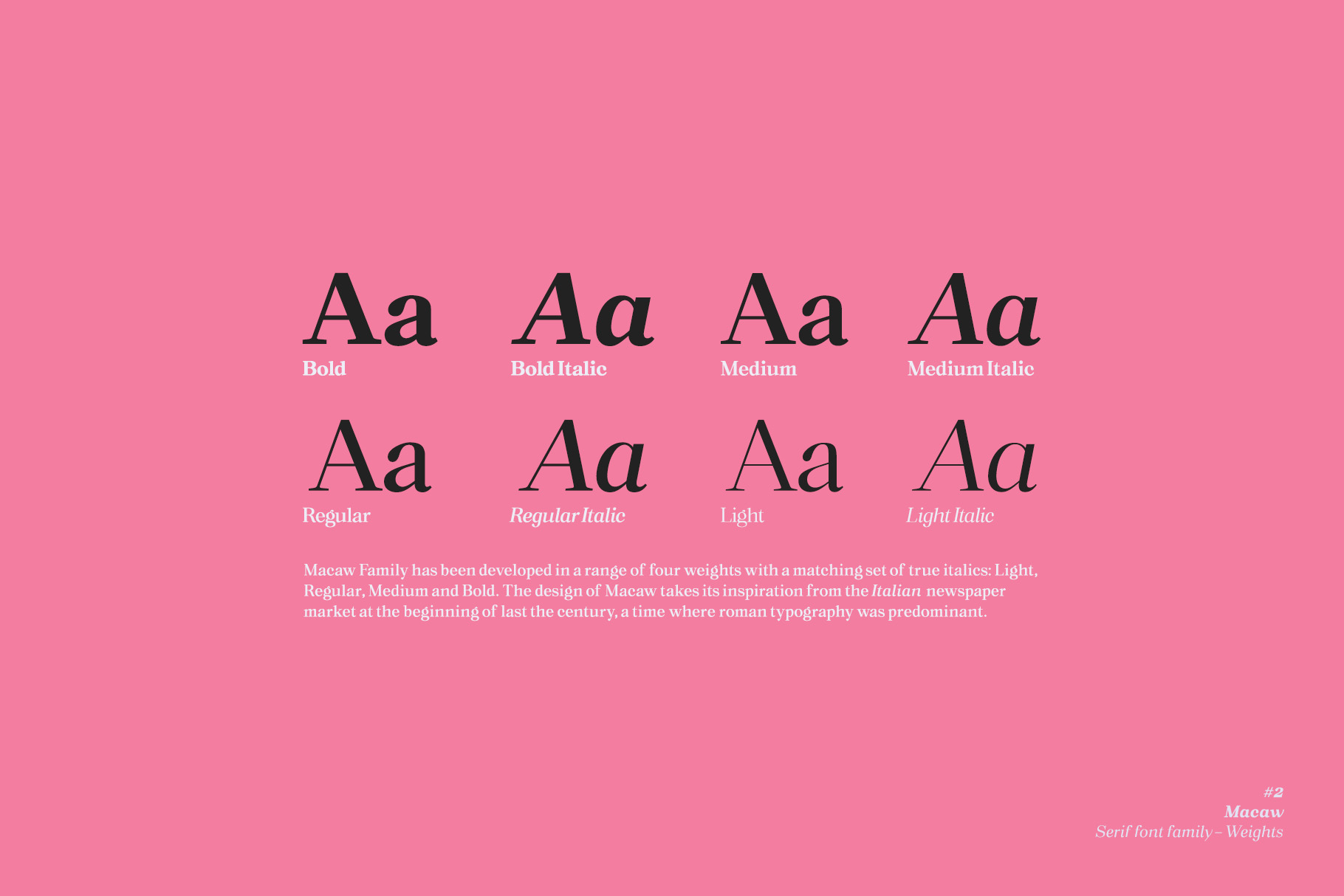 Developed in a range of four weights with a matching set of true italics, the design of Macaw takes its inspiration from the Italian newspaper market at the beginning of last the century, a time where roman typography was predominant. In fact, the main purpose of this typeface is to preserve versatility and legibility, to prescind from any text size.