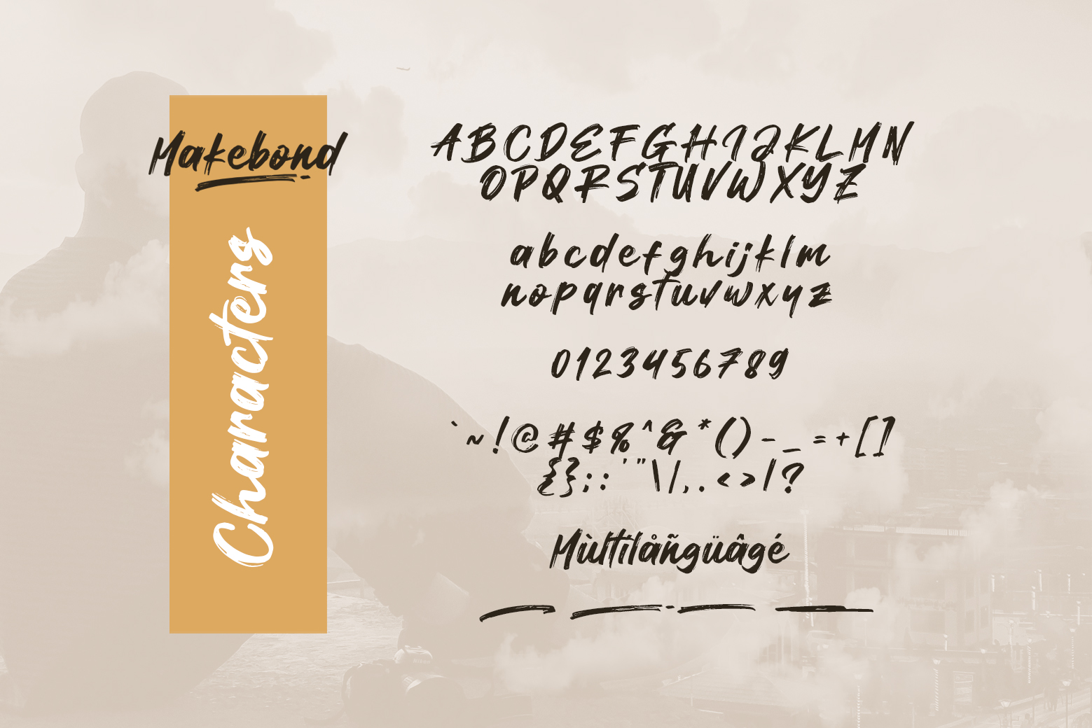 The Makebond is a modern brush font, elegant and modern feel character set. The Makebond font as well as multi-lingual support, uppercase, lowercase, numerals & punctuation.