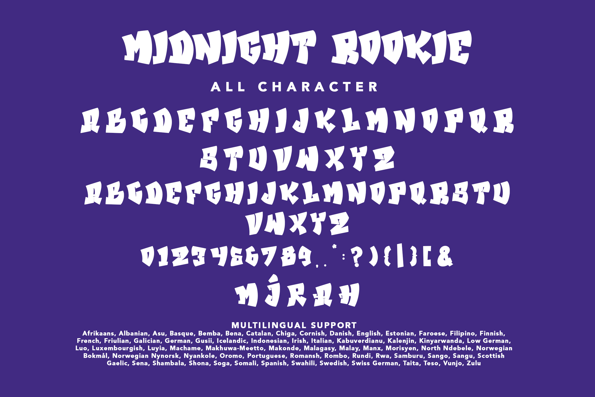 Midnight Rookie is a Graffiti Display Font. A typeface that brings the spirit and street style into typography design. With bold, expressive shapes, each letter in the Graffiti Display celebrates creativity and boldness in self-expression. Bold, squiggly lines, often with a rough and spontaneous touch, provide an authentic and energetic look. This font creates a dynamic and colorful atmosphere, reflecting life in the big city and the cultural diversity on the streets.
