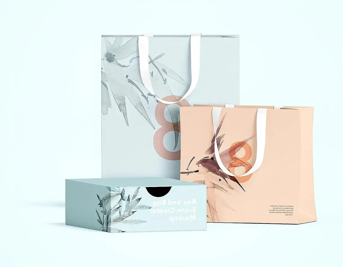 Very easy to replace your design by just using the Photoshop smart object on this high-resolution free PSD mockups. You can turn each separate bags and boxes from your Photoshop layer panel to showcase only what you want to showcase.