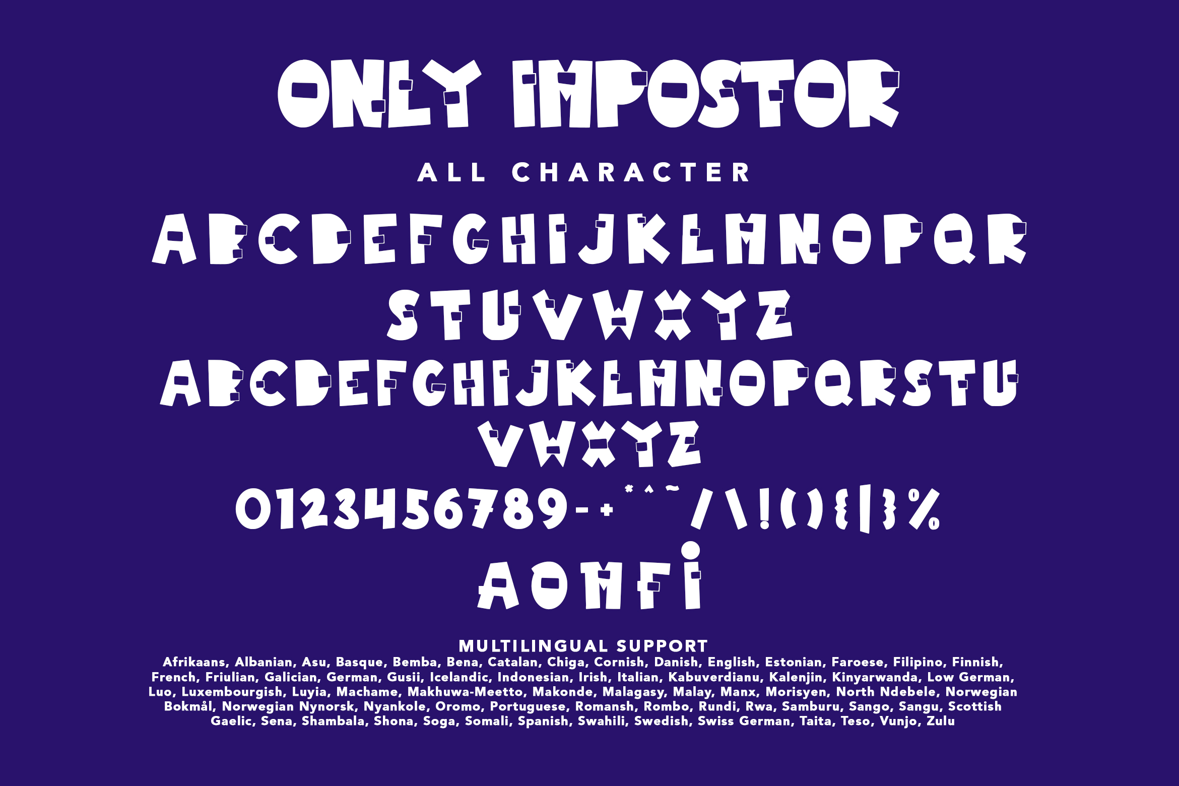 Only Impostor is a Comic Display Font. A typeface designed to showcase characters that are fun, expressive, and full of life, similar to the handwritten style often found in comics. With bold, linear, and often eccentric shapes, this font is designed to make a strong, clear impression when used in titles, typical comic text, or graphic designs with a comic feel.