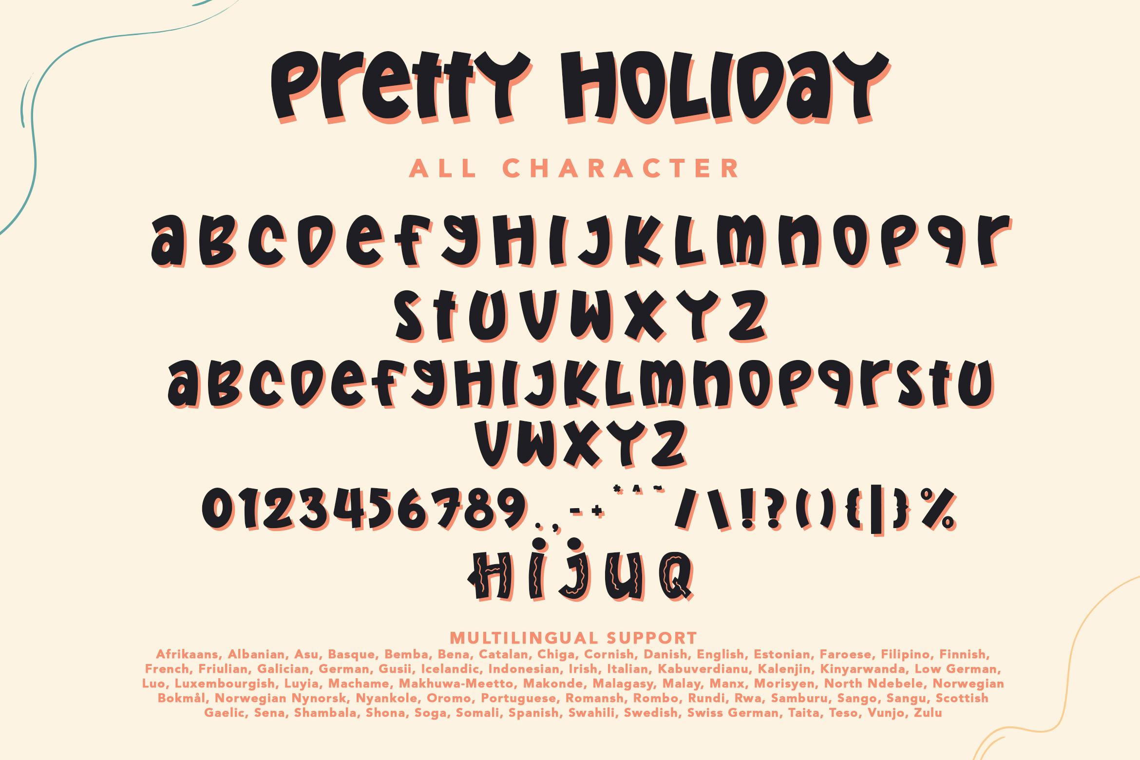 Pretty Holiday is a Playful Display Font. A typeface designed to showcase characters that are fun, expressive, and full of life, similar to the handwritten style often found in comics. With bold, linear, and often eccentric shapes, this font is designed to make a strong, clear impression when used in titles, typical comic text, or graphic designs with a comic feel.