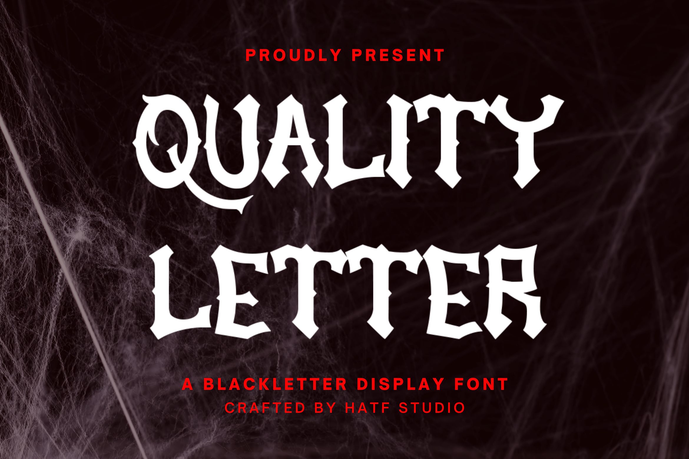 Quality Letter is a blackletter typeface, also known as Gothic or Old English, embodies a rich historical and cultural aesthetic with its distinctive and ornate letterforms. Rooted in medieval manuscript traditions, this typeface is characterized by its bold, angular strokes, sharp angles, and intricate detailing. The blackletter typeface exudes a sense of Gothic elegance and timelessness.