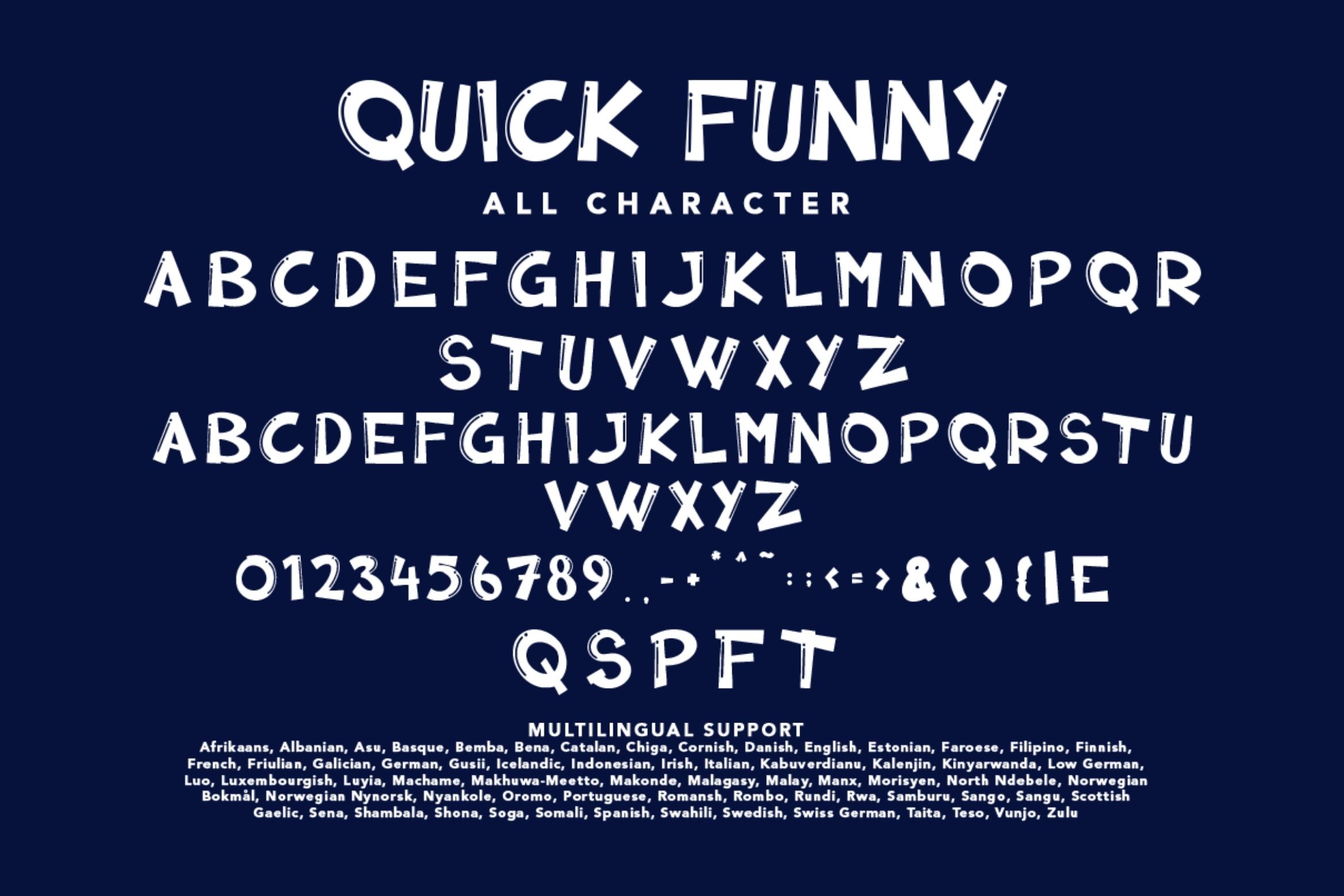 Quick Funny is a Playful Display Font. A typeface designed to showcase characters that are fun, expressive, and full of life, similar to the handwritten style often found in comics. With bold, linear, and often eccentric shapes, this font is designed to make a strong, clear impression when used in titles, typical comic text, or graphic designs with a comic feel.