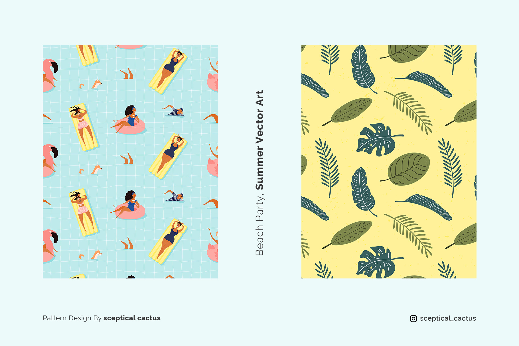 Note: The patterns used in the presentation are not included in the main file. We are very thankful to sceptical cactus for providing us these amazing patterns.  To download the patterns used in this mockup please check Beach Party, Summer Vector Art. For more patterns like these please check sceptical cactus.