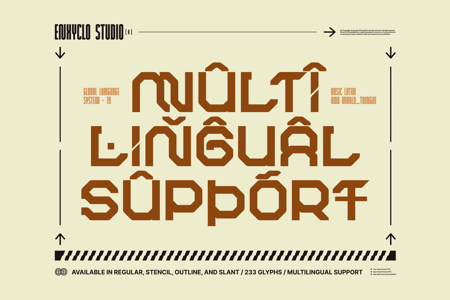 8 Styles: Regular, Slant, Outline, Outline Slant, Stencil, Stencil Slant, Stencil Outline, Stencil Outline Slant
