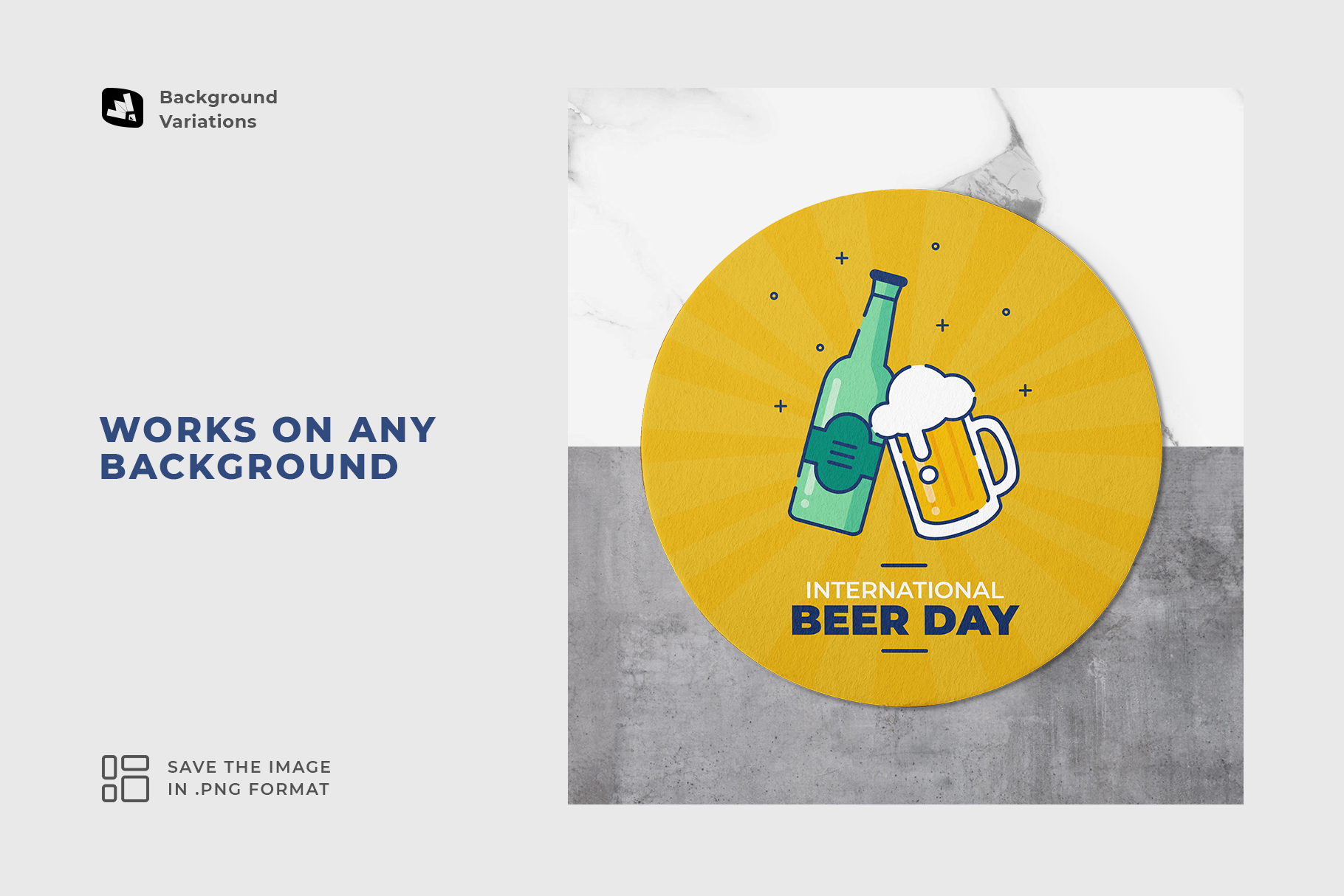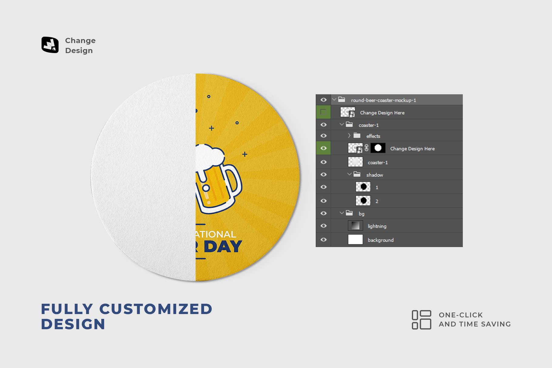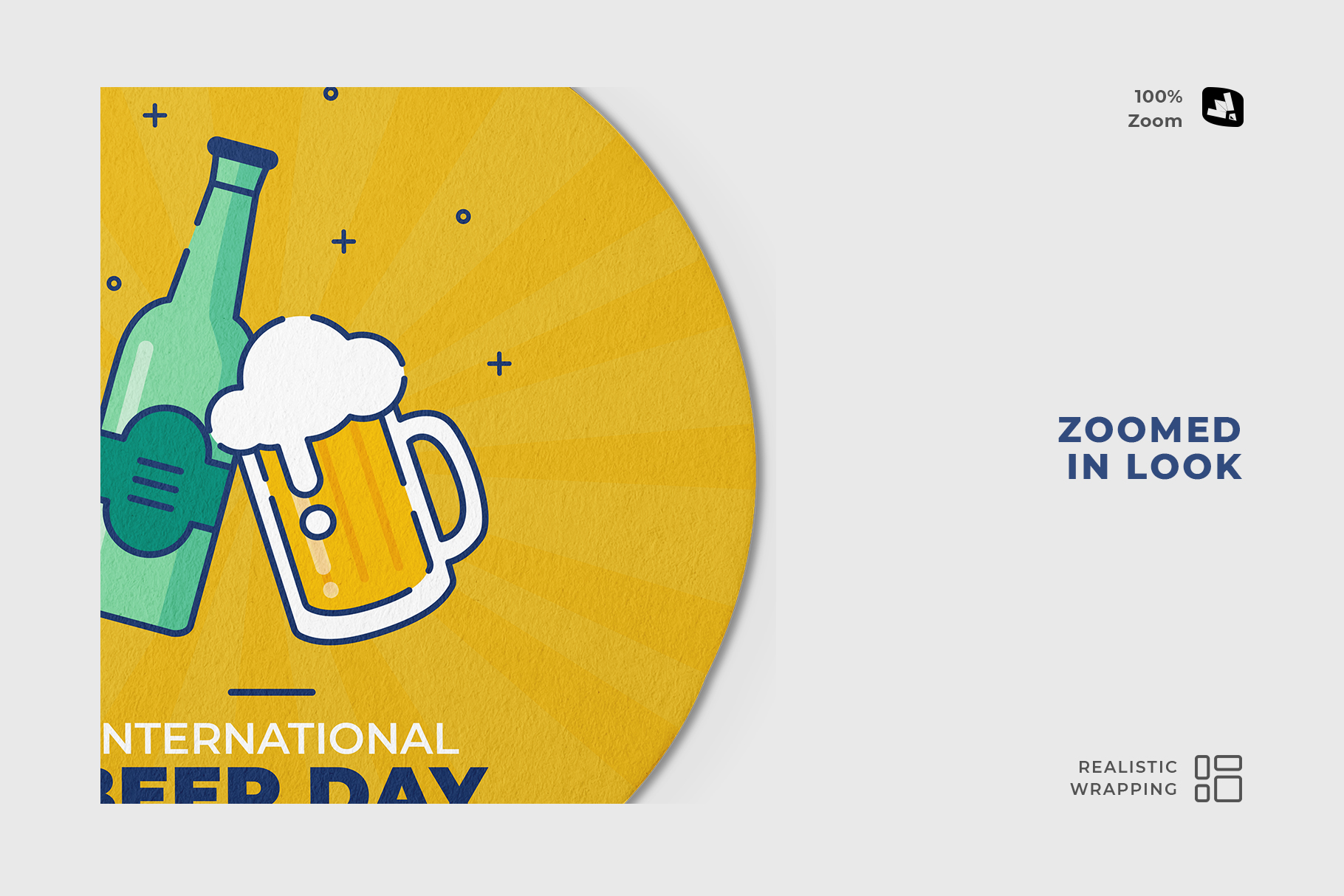 The mockup of beer coaster mockup is well-organized and offers essential features. Smart item shortcuts are provided at the top of each coaster mockup for easy access. The photorealistic coaster mockup templates are extremely detailed.