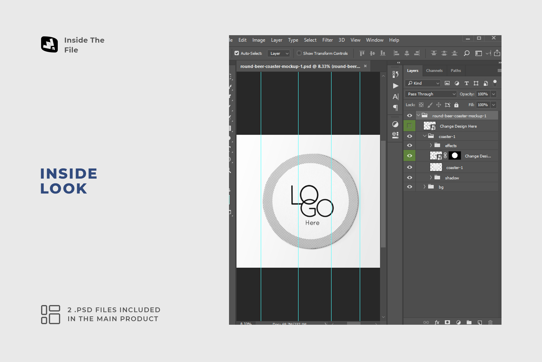 To use the coaster mockup, you’ll need Photoshop CC or above. The image editing procedure is simple and does not demand extensive Photoshop knowledge. The mockups are easy to customize and can be applied to any background.