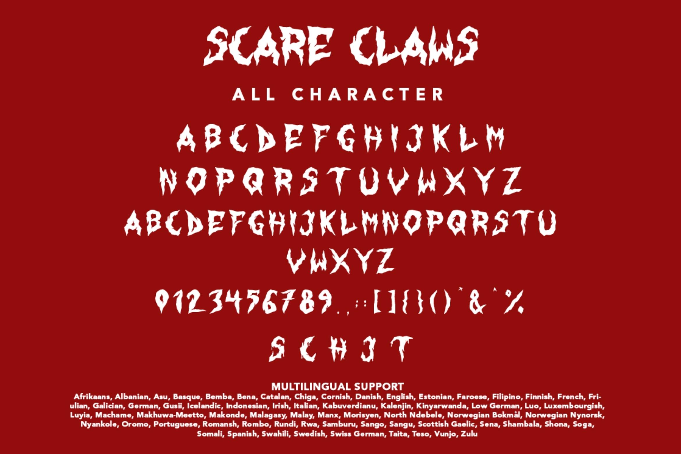 Immerse yourself in the charming aura of horror Scare Claws menacing horror display font. Meticulously crafted to orchestrate a bone-chilling experience of fear and suspense. Embodying solid lines, sharp angles, and details reminiscent of horror blackletter conventions, this typeface brings to life horror movie titles and Halloween posters among other eye-catching designs. His distorted and uneven writing evokes an unsettlingly eerie aura, reinforcing the underlying horror motif. The claw style incorporates scratched elements and sharp textures into the typography to create an irregular, broken look. The characters reveal a sinister, gritty, and gritty feel, conjuring a sense of unbridled chaos and destruction. Ideal for creating an apocalyptic or dystopian atmosphere, this font is suitable for projects that want to experiment with a very bold aesthetic, including music album covers, independent film posters, and unconventional graphic design endeavors.