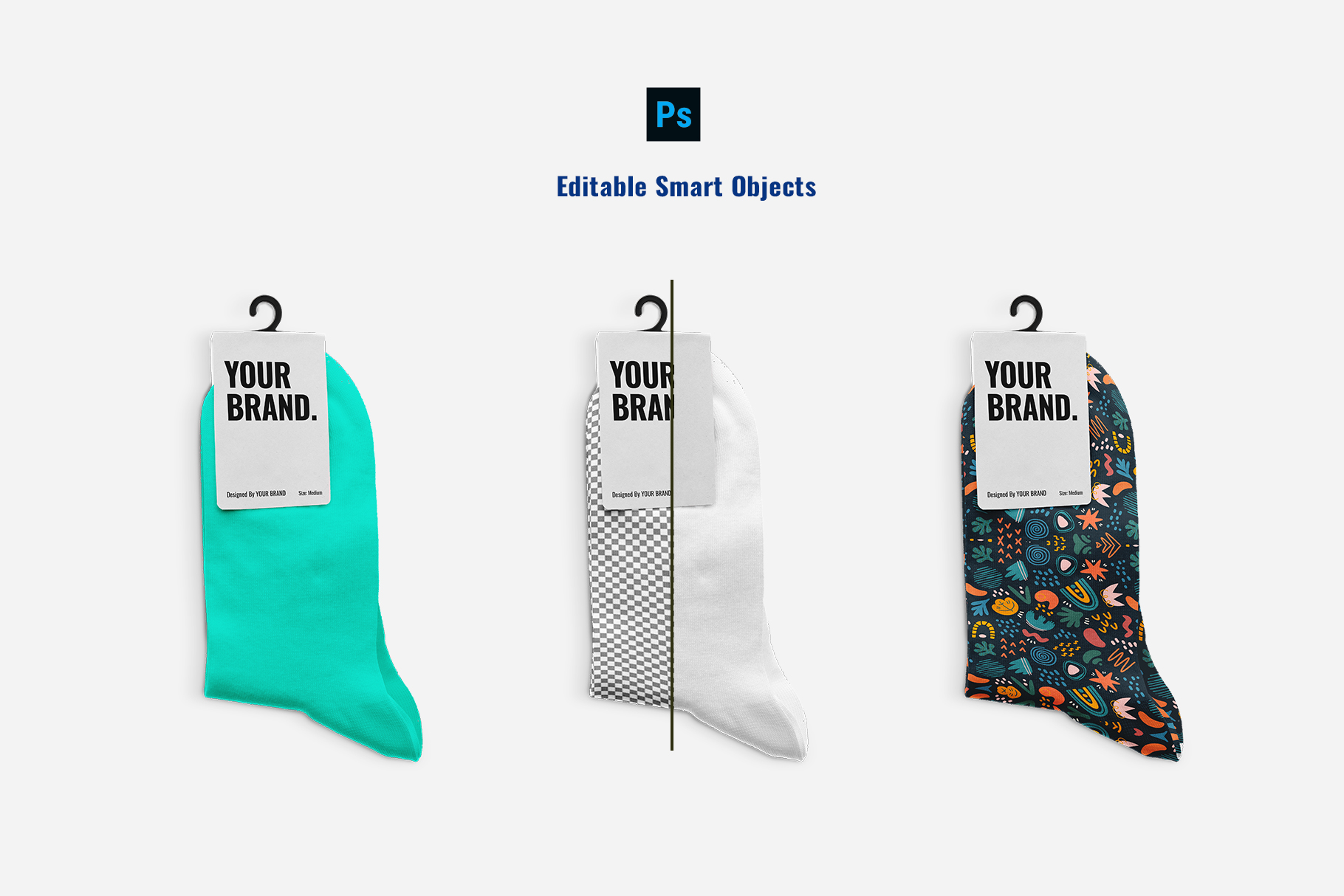 The casual socks mockup is well-organized and has all of the necessary features. Smart object shortcuts have been added to the top of the high socks mockup for fast access.