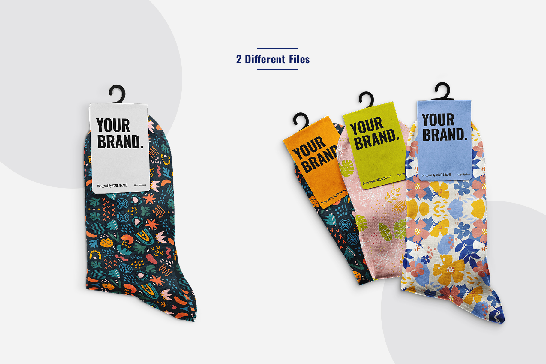 An excellent mockup of a pair of casual cotton socks. This sock mockup includes a single top view of a pair of socks as well as a set of three pairs of socks.