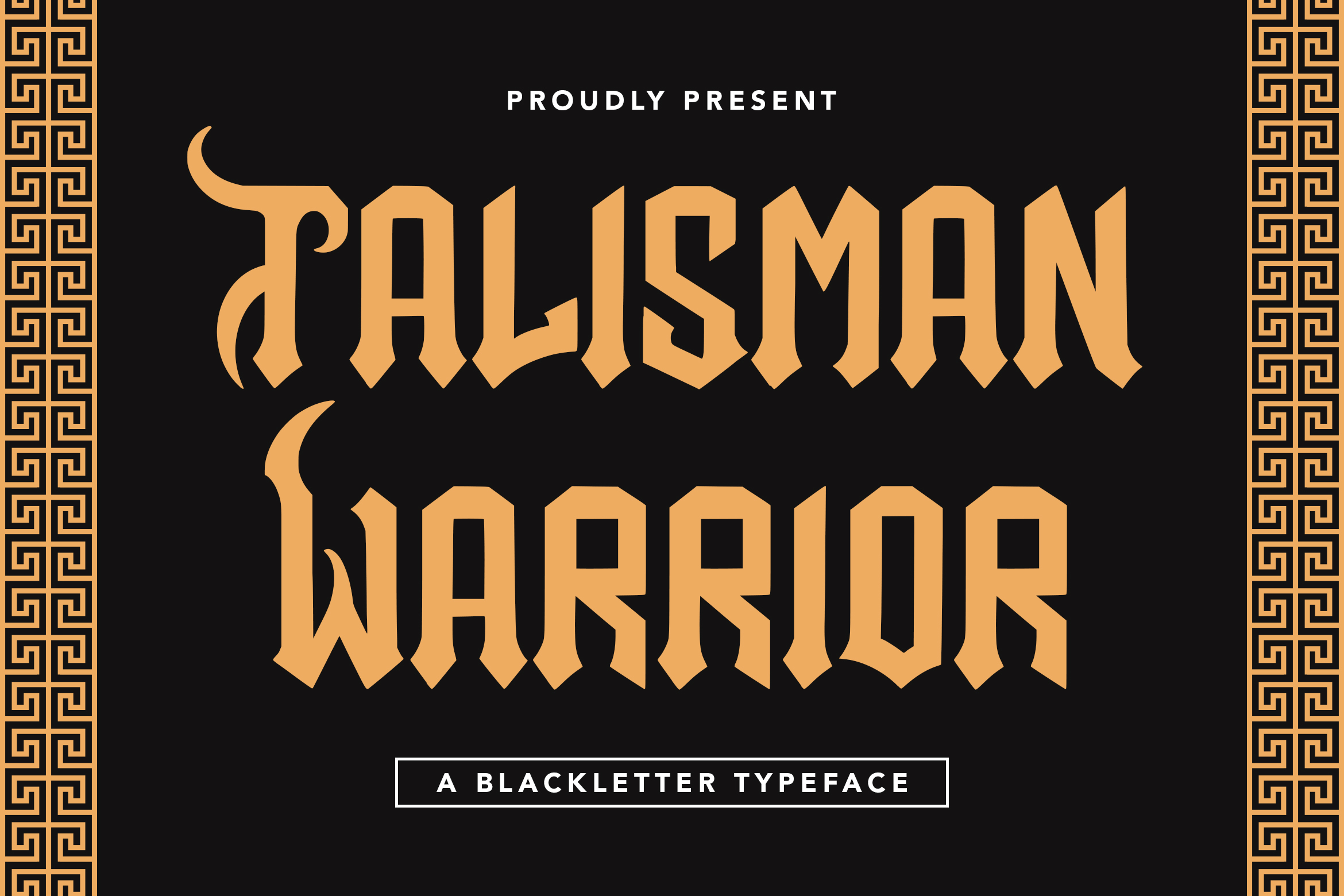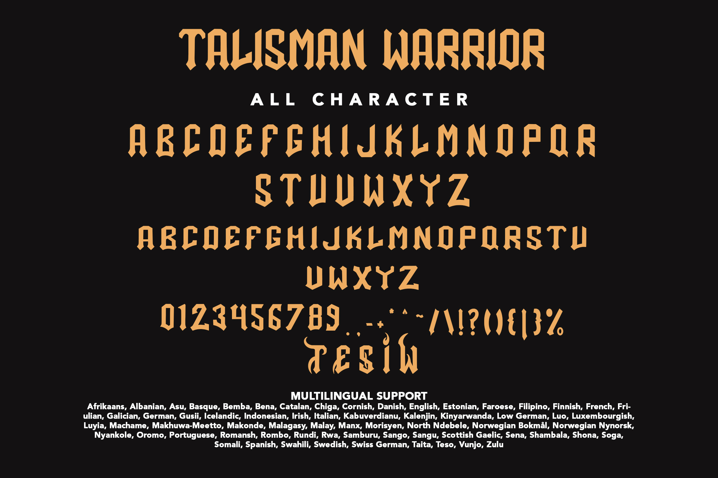 Talisman Warrior is a blackletter typeface, also known as Gothic or Old English, embodies a rich historical and cultural aesthetic with its distinctive and ornate letterforms. Rooted in medieval manuscript traditions, this typeface is characterized by its bold, angular strokes, sharp angles, and intricate detailing. The blackletter typeface exudes a sense of Gothic elegance and timelessness.