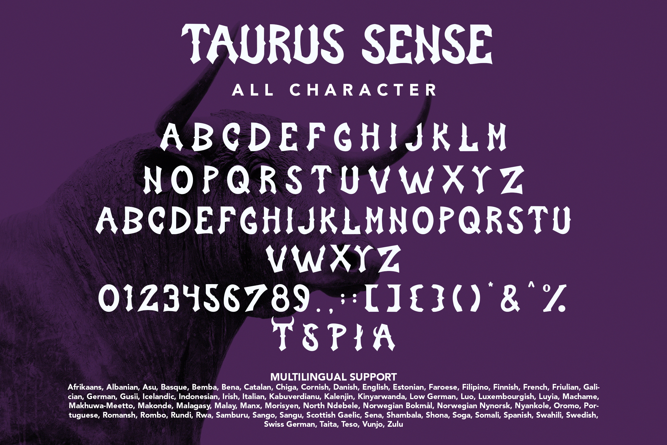 Taurus Sense is a blackletter typeface, also known as Gothic or Old English, embodies a rich historical and cultural aesthetic with its distinctive and ornate letterforms. Rooted in medieval manuscript traditions, this typeface is characterized by its bold, angular strokes, sharp angles, and intricate detailing. The blackletter typeface exudes a sense of Gothic elegance and timelessness.