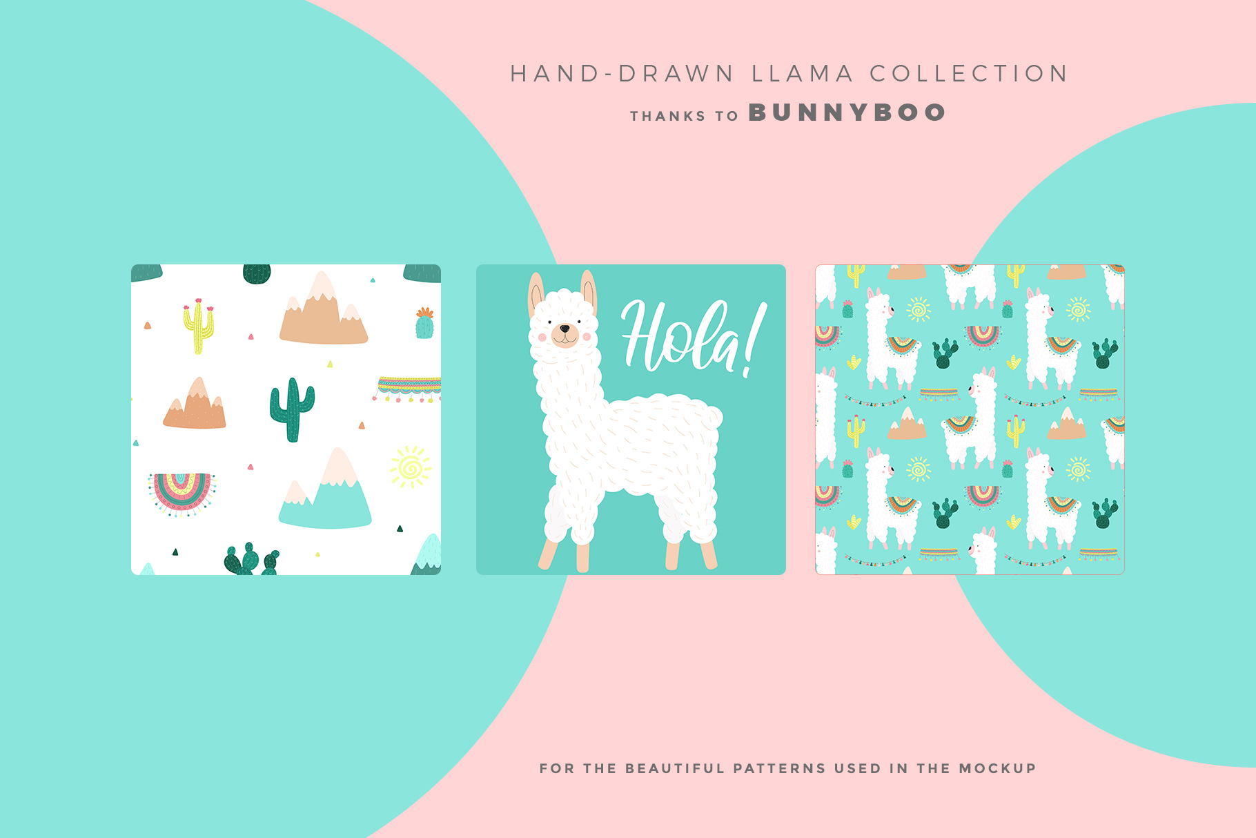 Note: The patterns used in the presentation are not included in the main file. We are very thankful to BunnyBoo for providing us these amazing patterns. To download the patterns used in this mockup please check the link Hand-drawn llama collection. You can check more patterns BunnyBoo.